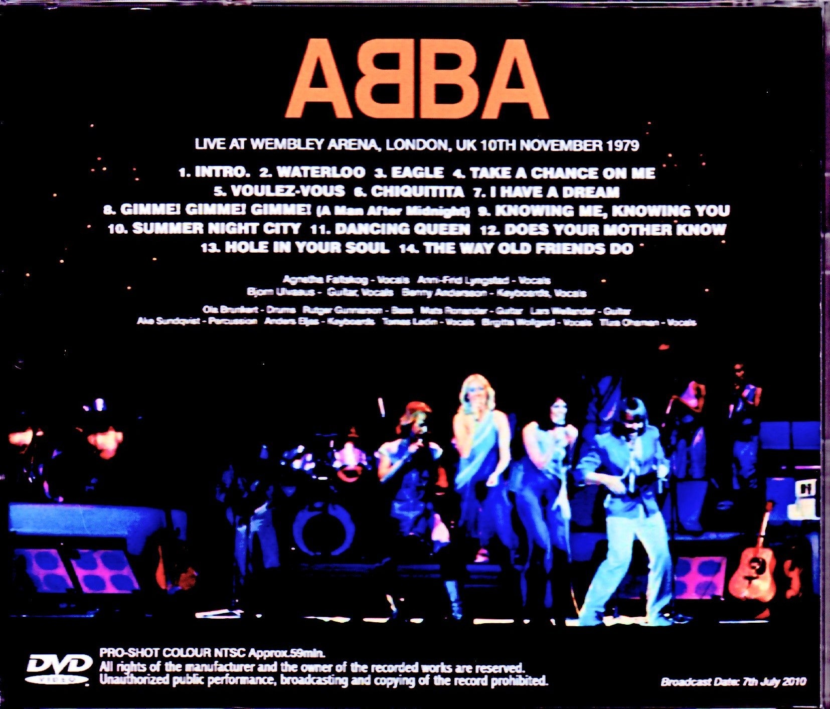 1. Intro 2. Waterloo. 3. Eagle. 4. Take A Chance On Me. 5. Voulez-Vous. 6. Chiquitita. 7. I Have A Dream. 8. Gimme! Gimme! Gimme! (A Man After Midnight) 9. Knowing Me, Knowing You. 10. Summer Night City. 11. Dancing Queen. 12. Does Your Mother Know. 13. Hole In Your Soul 14. The Way Old Friends Do PRO-SHOT COLOR NTSC Approx.59min.