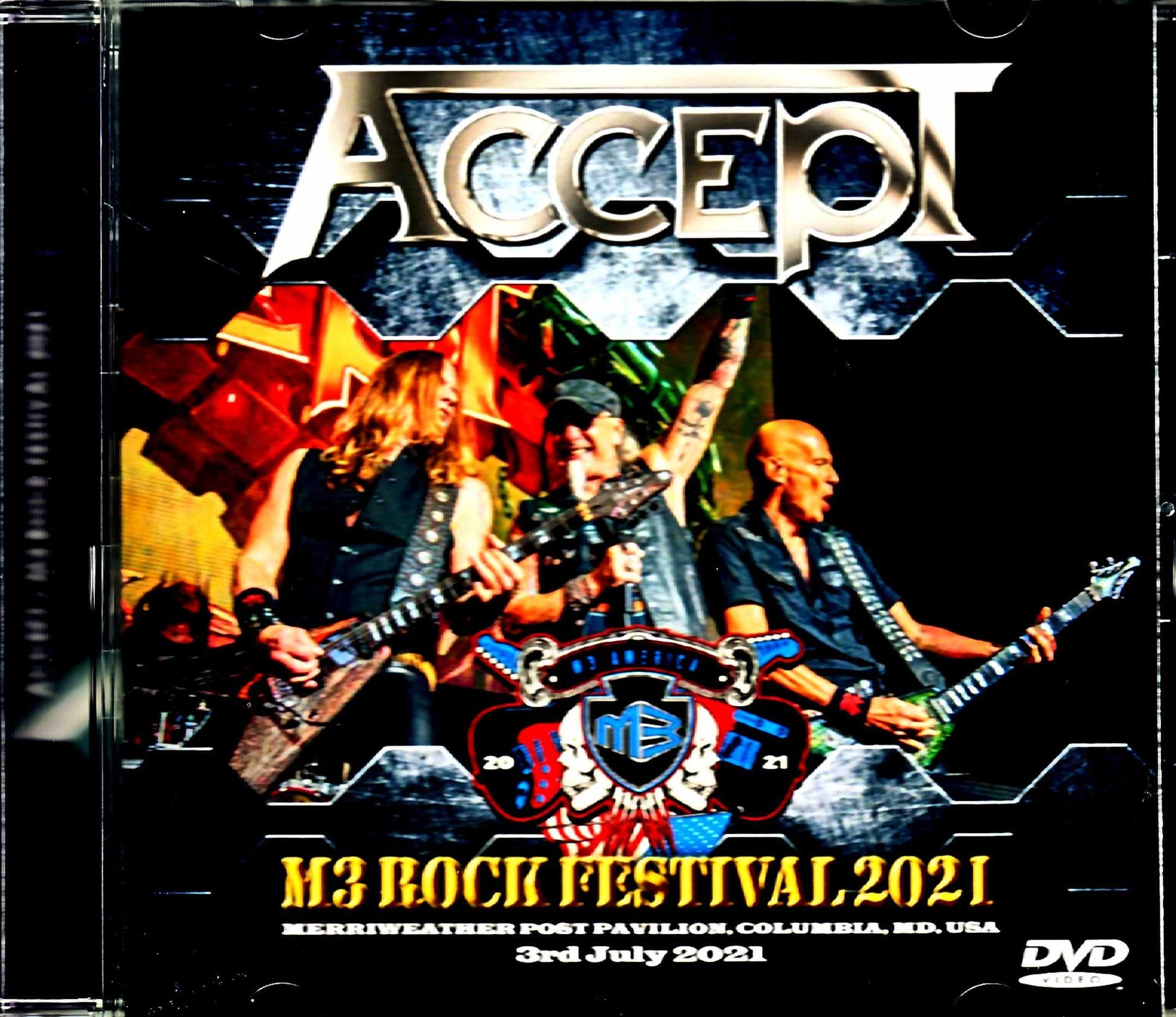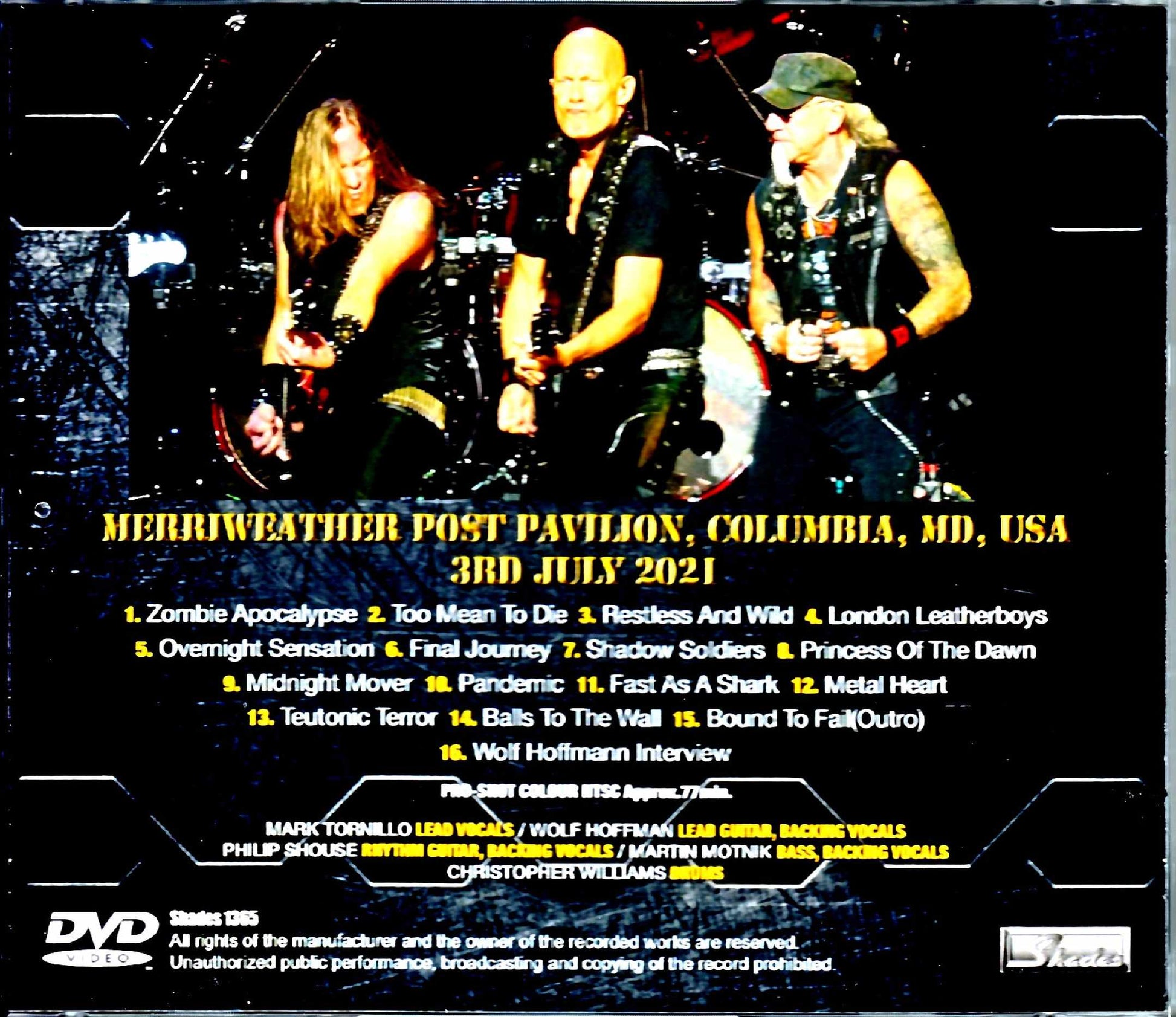 The heavy metal scene has finally overcome the new coronavirus pandemic and started to move forward. The latest professional shot of ACCEPT, the spearhead of this, is now available! This work was filmed at “July 3, 2021 Colombian performance.” This is a multi-camera professional shot taken when appearing at “M3 Rock Festival”. This work is the signal for the revival of the music genre ``heavy metal'', but it is also a declaration of the restart of ACCEPT, its main character. First of all, let's start with their current status, whose new work ``TOO MEAN TO DIE'' has been well received. 2021《“TOO MEAN TO DIE” released on January 29th》・July 2nd + 3rd/August 20th: North America (3 performances)←★Here★・December 10th + 11th: Japan (2 performances) 2022 - January 15th - February 28th: Europe #1 (32 performances) - June 8th - July 29th: Europe #2 (5 performances) This is the schedule announced so far. Although the album was released at the beginning of the year, the tour was postponed one after another due to the pandemic. Things are finally starting to move, but it's not like we'll be running at full power all of a sudden, so first we'll do test runs in the US and Japan. We are planning to embark on a full-fledged European tour in 2022. The Columbia performance of this work marks the beginning of such a restart. This is the second performance in a series of only three performances in North America. This work shot on such a stage is not only the most talked about best professional shot, but also the highest master among them. You might think that the image and sound quality of the latest distributed pro shots are of the perfect official quality...but that's not the case. In fact, there seem to be differences in the masters that are currently on the market depending on their origin, and in particular, the one published on a certain major video site has good image and sound quality, but it is a bad master with a mismatch between the video and the audio. Of course, this work is different from that. It is the best version with not only the highest image and sound quality, but also 100% perfect synchronization. And the show that is drawn with such an intimate feeling is extremely powerful. Let's also organize the set of "TOO MEAN TO DIE Tour" that appeared for the first time. Classics (7 songs) - Restless And Wild / Princess Of The Dawn / Fast As A Shark - Balls To The Wall: London Leatherboys / Balls To The Wall - Metal Heart: Midnight Mover / Metal Heart Tonillo Era (7 songs)・Blood of the Nations: Pandemic/Teutonic Terror・Stalingrad: Shadow Soldiers・Blind Rage: Final Journey・To Mean To Die: Zombie Apocalypse/Too Mean To Die /Overnight Sensation...and it looks like this. There are three new songs that are attracting attention, with a balance of 80's and post-resurrection songs. It's a shame that "The Undertaker", which was played on the first day, fell, but it can't be said to be luxurious just because it's a festival. Another thing that caught my attention was the ensemble that evolved into a triple guitar... but again, the result was a little surprising. The players playing in this work are Wolf Hoffmann and new member Philippe Shaws, and Uwe Ruiz is not present. In next year's European tour information, they are enthusiastic that ``three guitarists will blow the virus into oblivion,'' so it seems that Uwe will also be on board... In any case, there's no way that the twins are unsatisfactory as they have been until now, and I'm actually surprised by Philippe's skill in not only harmonizing, but also deciding on formations. Additionally, the festival itself has a sense of restart. (Perhaps they were prepared for the unlikely event of cancellation as it was the first revival of the show.) The scale is small, and it is different from the super spectacles such as "WACKEN" and "HEROES OF WORLD ROCK" that appeared before the pandemic. The number of lights and camera work are small. The atmosphere of such a festival is real, but on the other hand, the lack of gorgeous viewing angles also means that the rawness of the live performance is lacking. The sound board directly connected to the mix table, where you can hardly hear loud cheers, has a great sense of synchronization with the band, and the indifferent camera work is also used frequently for deadly close-ups. Rather, the presence of the band itself is more than just a normal professional shot. Although they are still a bit lacking in their ability to demonstrate their true potential and drive at full speed, they will be able to show it off in their performance in Japan just before their European tour. This work is a one-of-a-kind video work that is perfect for preparing for such a visit to Japan, and is the signal for the revival of heavy metal. Heavy metal music is finally returning to the world. Multi-camera professional shot of “July 3, 2021 M3 Rock Festival”. The image and sound quality are of the latest distribution professional shots, so there is no need to ask questions, and the audio quality is official, and the audio directly connected to the mix desk, which is far away from loud cheers, brings out the rawness of a live performance. Due to the absence of Uwe Ruiz, it is not the triple guitar that attracted attention, but the new member Philip Shaws is in perfect condition. You can also enjoy the new songs "Zombie Apocalypse", "Too Mean To Die" and "Overnight Sensation" from "TOO MEAN TO DIE", which is only the second time, in official quality. Live at Merriweather Post Pavilion, Columbia, MD, USA 3rd July 2021 PRO-SHOT (77:17) 1. Zombie Apocalypse 2. Too Mean To Die 3. Restless And Wild 4. London Leatherboys 5. Overnight Sensation 6. Final Journey 7 . Shadow Soldiers 8. Princess Of The Dawn 9. Midnight Mover 10. Pandemic 11. Fast As A Shark 12. Metal Heart 13. Teutonic Terror 14. Balls To The Wall 15. Bound To Fail(Outro) 16. Wolf Hoffmann Interview Mark Tornillo – lead vocals Wolf Hoffman – lead gui