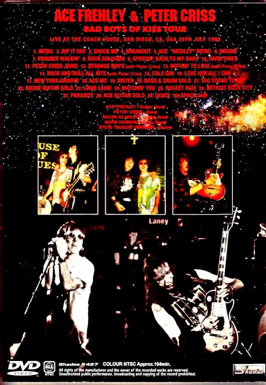 Prior to the reunion of KISS, Ace Frehley was warming up his old friendship with Peter Criss on his solo tour in 1995. Here is a super close-up video that allows you to experience the scene at its best. This work was filmed at the "San Diego performance on July 29, 1995". It's a super-class audience shot... probably. The biggest point of this work is the strange quality that is so far removed from the audience that it makes you feel unreliable, but first of all, the position of the show. 1995 was the year they released "KISS UNPLUGGED," which was a major turning point for them, so let's take a look back at their schedule from that time as well.・January 1st: Brooklyn performance・February 19th-25th: North America #1 (3 performances)・March 13th-25th: North America #2 (4 performances)・May 25th-28th: North America #3 (4 performances)・June 13th: Oslo performance・June 22nd-August 8th: North America #4 (26 performances)←★Here★*August 9th: MTV appearance "KISS UNPLUGGED"・August 11th+12th: North America #5 (2 performances)・September 2nd-30th: North America #6 (8 performances)・November 1st-December 16th: North America #7 (24 performances)This is Ace Frehley in 1995. When lined up like this, they seem to be active, but if you look closely, they mainly do casual activities with a few performances a month. Only "North America # 4" and "North America # 7" were so-called "tours" that moved between stages every night. Among them, the San Diego performance of this work is the former. It was the 18th performance of "North America # 4", which was 11 days away from the fateful "KISS UNPLUGGED". This work recorded at such a show is a super shot that makes you wonder "Is this the audience ...? Isn't it?" What is amazing, that position? Apparently the scene seems to be a small club, but it is completely in the front row ... or rather, it feels like it is half on the stage. It feels like you are looking at Ace from the left side, and it is so close that you can see the back of the monitor amplifier without any hiding. The audience is not reflected at all until you look back between songs, and if there was no reaction from the MC between songs, it is a video of "only the band and myself" that you would think it was a studio rehearsal. This is just a guess, but I think it was a shot taken by a staff member for fodder. Richie Scarlett, who plays guitar with Ace, comes over to the camera to appeal to the camera when he is playing solo, and even high-fives Ace. In the mid-90s, not everyone was taking photos like today, and if Axl Rose found you, you would get punched. He was close enough to hit you if you reached out, and he was so familiar with the members that it was hard to believe he was just a fan. Anyway, this exclusive shot depicts a full show that covers a wide range of careers. Let's organize the contents here. KISS numbers: KISS: Nothin' To Lose (★), Cold Gin, Deuce, HOTTER THAN HELL: Strange Ways (★), Watchin' You, Parasite, DRESSED TO KILL: Rock and Roll All Nite (★), Love Her All I Can, DESTROYER: Detroit Rock City, LOVE GUN: Shock Me, ALIVE II: Rocket Ride Solo: ACE FREHLEY: Rip It Out, New York Groove, FREHLEY'S COMET: Breakou, TROUBLE WALKIN': 2 Young 2 Die, ANOMALY: Sister Others: Louie Louie, Space Jam, Medley: Insane, Trouble Walkin', Rock Soldiers, Speedin' Back To My Baby, Hard Times *Note: Songs marked with "★" feature Peter Criss. ...And so it goes. A barrage of great songs, some of which are even compressed into a medley. The middle part is particularly noteworthy. It's three songs with Peter Criss. As soon as Ace called out his name, the temperature in the small club rose by about 5 degrees and Peter appeared. However, Peter's role is not drums but vocals. He sings "Strange Ways" with a tambourine in hand, and is the main chorus for "Nothin' To Lose" and "Rock and Roll All Nite". They're probably all drunk, but they're hugging each member while staggering around the stage, and enjoying the chorus of "Rock and Roll All Nite!" with the audience. Another interesting song is "Breakout". Here, Ace starts with the words "For Eric Carr!" and Richie sings. Anyway, it's a shot in front of you that gives you a homely mood and a closed room feeling. Rather than being a concert audience, you can become Ace's friend and participate in the club party. A secret one that shares an experience that can only be envied. A super-class audience shot of the "San Diego performance on July 29, 1995"...or rather, it was probably taken by someone related to the band. It was captured from the front row of a small club, with a close-up feeling as if you were half on the stage. You can even see Ace's monitor amp from the back (Ritchie Scarlett looks at the camera and high-fives Ace...it's an intimacy that is impossible for ordinary fans). This is a superb video that allows you to enjoy a wide range of masterpieces from a wide range of careers, including three songs in which Peter Criss participates as a vocalist, right in front of you. The Coach House, San Diego, CA, USA 29th July 1995 AMAZING SHOT! s (with Peter Criss) 13. Nothin' To Lose (with Peter Criss) 14. Rock and Roll All Nite (with Peter Criss) 15. Cold Gin 16. Love Her All I Can 17. New York Groove 18. Ace 19. Sister 20. Bass & Drum Solo 21. Too Young To Die 22. Richie Guitar Solo 23. Louie Louie 24. Watchin' You 25. Rocket Ride 26. Detroit Rock City 27. Parasite 28. Ace Guitar Solo 29. Deuce 30. Space Jam Ace Frehley - Guitar, Vocals Richie Scarlet - Guitar, Vocals Mark Nomand - Bass, Vocals Steve "Budgie" Warner - Drums Peter Criss - Vocals, Tambourine (Special Guest) COLOUR NTSC Appro x.104min.