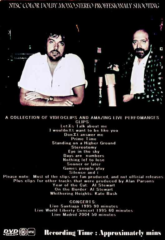 Alan Parsons Live Project Promos & Performances A COLLECTION OF VIDEOCLIPS AND AMAZING LIVE PERFOMANCES. CLIPS: Letエs Talk about me I wouldnエt want to be like you Don't answer me Prime Time Standing on a Higher Ground Stereotomy Eye in the sky Days are numbers Nothing lef to lose Sooner or later Games people play Silence and i Please note: Most of the clips are fan produced, and not official releases. Plus clips for other tracks that were produced by Alan Parsons Year of the Cat: Al Stewart On the Border: Al Stewart Whithering Heights: Kate Bush CONCERTS: Live Santiago 1995 90 minutes Live World Liberty Concert 1995 60 minutes Live Madrid 2004 50 minutes TIME 262min RANK A PRO SHOT