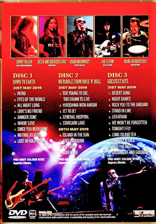 Tsutaya O-East, Tokyo, Japan 28th & 31st May 2019 PRO-SHOT(from Original Masters) Disc 1: DOWN TO EARTH LIVE Tsutaya O-East, Tokyo, Japan 31st May 2019 1. Intro 2. Eyes Of The World 3. All Night Long 4. Love's No Friend 5. Danger Zone 6. Makin' Love 7. Since You Been Gone 8. No Time To Lose 9. Lost in Hollywood PRO-SHOT COLOUR NTSC Approx.44min. Disc 2: NO PAROLE FROM ROCK 'N' ROLL LIVETsutaya O-East, Tokyo, Japan 31st May 2019 1. Too Young To Die, Too Drunk To Live 2. Hiroshima Mon Amour 3. Jet To Jet 4. General Hospital 5. Starcarr Lane Tsutaya O-East, Tokyo, Japan 28th May 2019 6. Island In The Sun 7. Kree Nakoorie 8. Big Foot 9. Suffer Me PRO-SHOT COLOUR NTSC Approx.44min.Disc 3: GREATEST HITS LIVE Tsutaya O-East, Tokyo, Japan 31st May 2019 1. Desert Song 2. Night Games 3. Rock You To The Ground 4. Stand In Line 5. Leviathan 6. We Won't Be Forgotten 7. Tonight I Fly 8. Long Island Tea 9. Assault Attack 10. Into The Night 11. Goodnight And Goodbye PRO-SHOT COLOUR NTSC Approx.56min. PRO-SHOT COLOUR NTSC Approx.144min.(Total) Graham Bonnet - Vocals Joe Stump - Guitar Jimmy Waldo - Keyboards Beth-Ami Heavenstone - Bass Mark Benquechea - Drums