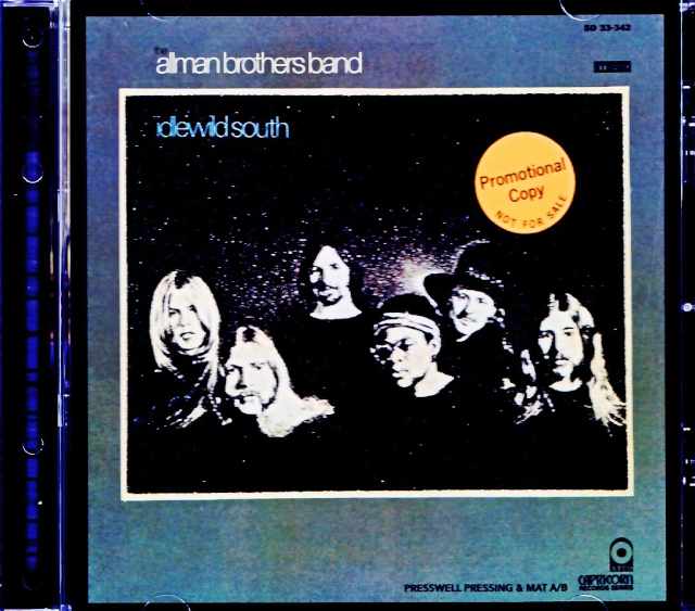 These two classic studio albums by the Allman Brothers Band, produced during the lifetime of Duane Allman, a guitarist admired by Clapton himself, are once again available in clean transfers from a miraculous premium item: a US original, a "Promotional Copy" pressed earlier than general distribution, produced at the label's main plant, Presswell, and with a perfect first-press "A/B" matrix. This is the band's second album, which marked a major evolution in the band's sound from their debut! This superb condition ensures the freshness of the master tapes is preserved in the highest quality possible! Also available on CD is the mega-rare promo pressing of "IDLEWILD SOUTH," the second album and the masterpiece that established the Allman Brothers' "Southern Rock" sound! Naturally, this album also had a promo pressing produced at the label's main plant, Presswell, in New Jersey. In fact, even this promo pressing is extremely difficult to obtain. While it certainly sold better than the first album, it's still like comparing two chestnuts. This title makes mint-condition promo copies extremely difficult to obtain. Finding a copy in decent condition on the secondhand market is a daunting task, and even when it does appear, crackling and popping is a given. Even the original copy is difficult to find, but this first-press promo copy presents even greater challenges. Meanwhile, "IDLEWILD SOUTH" miraculously achieved a meticulous transfer from a mint-condition promo copy (naturally pressed at the label's main Presswell plant, with the same matrix as the first-press "A/B"!). As you'd expect, "IDLEWILD SOUTH" is impressive for its refined sound, a major leap from the raw sound of the debut album. The opening track "Revival" and "Midnight Rider," one of the album's signature tracks, feature striking acoustic arrangements. Because of this, scratch noise is highly noticeable on analog LPs for these two tracks, which have many quiet passages. In fact, many people have listened to them despite the noise. However, this time, the transfer is once again astonishingly clean. From the intro of the opening track, "Revival," there's no scratch noise at all, no matter how loud you turn up the volume! And yet, the sound quality itself is so fresh and natural. Listening to these two acoustic tracks, the difference in sound quality compared to the current remastered CD is overwhelmingly clear. Not only are they clear and natural, but the "airiness" these two tracks exude is also clearly palpable. This airy feeling is completely different from the current CD. You'll be amazed, wondering if this is the original sound from the master tape recorded in 1970. The difference is also clear with "In Memory Of Elizabeth Reed," the greatest track from "IDLEWILD SOUTH." Indeed, the current remastered CD technology is a perfect match for the Allmans' performance, just like the first album, delivering a powerful performance befitting the CD era. However, the 1970 promo disc surpasses the previous release in its exquisite clarity and naturalness. Turn up the volume to truly experience it, as if you were actually in the recording studio listening to the Allmans perform. The difference is simply incredible. This masterpiece, their second album, marked a major leap forward before the legendary "AT FILLMORE EAST." Once again, the disc captures the authentic sound that could only be experienced in 1970 with astonishing clarity. Experience the naturalness of the original promo disc, a quality you'll never experience with current remasters, featuring beloved tracks like "Midnight Rider" and "In Memory of Elizabeth Reed." We promise you a premium listening experience with the finest sound quality! US ORIGINAL GENUINE FIRST PRESSING PROMO COPY EDITION - "PRESSWELL PRESSING & MAT A/B"(1CD) (31:00) 1. Revival 2. Don't Keep Me Wonderin' 3. Midnight Rider 4. In Memory Of Elizabeth Reed 5. Hoochie Coochie Man 6. Please Call Home 7. Leave My Blues At Home