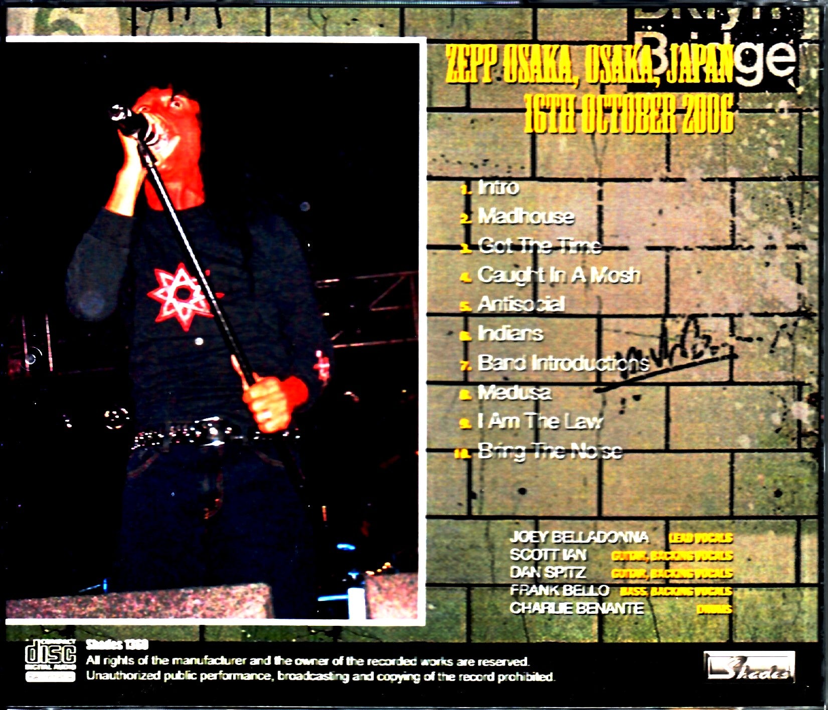 Osaka in 2006 was the final stage for the “Golden Five”. Introducing an original recording that will be released for the first time in the world where you can witness that historic scene. What is infused into this work is the "October 16, 2006: Zepp Osaka" performance. This is a superb audience recording recorded at the memorable first “LOUD PARK” venue in Osaka. At that time, ANTHRAX brought back Joey Belladna/Dan Spitz and decided to reunite. The whole world was intoxicated by the revival of the Golden Age. This is also a good opportunity, so let's look back on the entire activities of the first reunion era and check the show's position. 2005《April Joey Belladna & Dan Spitz return》 ・April 29th - May 1st: North America #1 (3 performances) ・May 4th - 7th: Europe #1 (3 performances) ・5 May 12th to 18th: Australia (5 performances), May 21st to June 1st: North America #2 (3 performances) ← *Official ALIVE 2, June 9th to July 16th: Europe #2/ Puerto Rico (24 performances) September 6th – October 30th: North America #3 (35 performances) 2006 January 6th – 21st: North America #4 (13 performances) April 7th – 29th: Europe #3 (19 performances), June 30th - August 6th: North America #5 (32 performances), October 14th + 16th: Japan (2 performances) ←★Here★ 《Bella Donna & Spitz leave》This is the first era of reunion. After that, Joey is still at the front after passing through Dan Nelson and John Bush (second round), but Spitz, who left here, has not returned. As a result, the "Golden Five" who were all the rage in the 1980s were only together for about a year and a half. Even in such a “true reunion era”, the appearance on “LOD PARK 06” was at the end. Yes, this work was the last show by the “Golden Five”. This work recorded at such a historical site is truly a superb recording with "super". After all, the person who worked on this work is "Western Japan's Strongest Taper", who is well known at our store. As his name suggests, he is a master among masters in western Japan... no, even by world standards, there is no one who can record HR/HM. If you are interested in this article, you have probably experienced more than one of the recordings by Mr. Saikyo. board" itself. Of course, this work also has plenty of that flavor and awesomeness. Although it may not be the best masterpiece now because it is in the early days of the "strongest" collection, it is still a super-excellent recording that is firmly pierced with the same "aesthetics of steel sound". What is depicted with its strongest sound is the final brilliance of the true reunion. This day is also the first coupling with MEGADETH/DIO, so the running time is just under 50 minutes, but in that short time, the special songs are concentrated. Now, let's organize this dense set. Original (5 songs)・Crazy Thrash Infection: Madhouse/Medusa・Among the Living: Caught In A Mosh/Indians/I Am The Law Cover (3 songs)・Got The Time (★)/Antisocial/Bring The Noise (★) *Note: Songs marked with “★” cannot be heard in the official work “ALIVE 2”. ...and it looks like this. Two great albums ``SPREADING THE DISEASE'' and ``AMONG THE LIVING'' that are engraved in the souls of thrashers have been carefully selected to fill one side of the LP (5 songs), symbolizing the late Joey era with 3 major covers. This is a super concentrated selection of the best songs, on the verge of being boiled down and reduced to powder. And the performance that spells out that special set... there's no need to put it into words. The ensemble, which toured the world for a year and a half, went beyond a simple reunion, and ran through the entire series without getting tired of the short time available. It is a tremendous live performance that lightly bounces back the heaviest historical fact of “the last of the golden five”. Don't underestimate it as just a stocked audience recording. Superlative guest recording sound, ultimate best song selection, and heavy historical significance...This is ANTHRAX's most important live album in every sense of the word. A truly world-class masterpiece from Japan. An absolute must-have for metal artists living in the modern era. A superb audience recording of the last night of the "Golden Five" performance "October 16, 2006 Zepp Osaka" with Joey Belladna & Dan Spitz. Mastered by our store's well-known ``strongest taper in West Japan'', the sound is extremely thick, close-fitting, and separate, making it ``just like a soundboard.'' This is a powerful and beautiful recording that is permeated with the aesthetics of steel sound. This is the most important live album where you can experience the ultimate set of ``SPREADING THE DISEASE/AMONG THE LIVING concentration + 3 major covers'' at the final performance of Spitz, who did not make a comeback worldwide. Live at Zepp Osaka, Osaka, Japan 16th October 2006 TRULY PERFECT SOUND(from Original Masters) (48:06) 1. Intro 2. Madhouse 3. Got the Time 4. Caught in a Mosh 5. Antisocial 6. Indians 7. Band Introductions 8. Medusa 9. I Am the Law 10. Bring the Noise Joey Belladonna – lead vocals Scott Ian – rhythm guitar, backing vocals Dan Spitz – lead guitar, backing vocals Frank Bello – bass, backing vocals Charlie Benante – drums