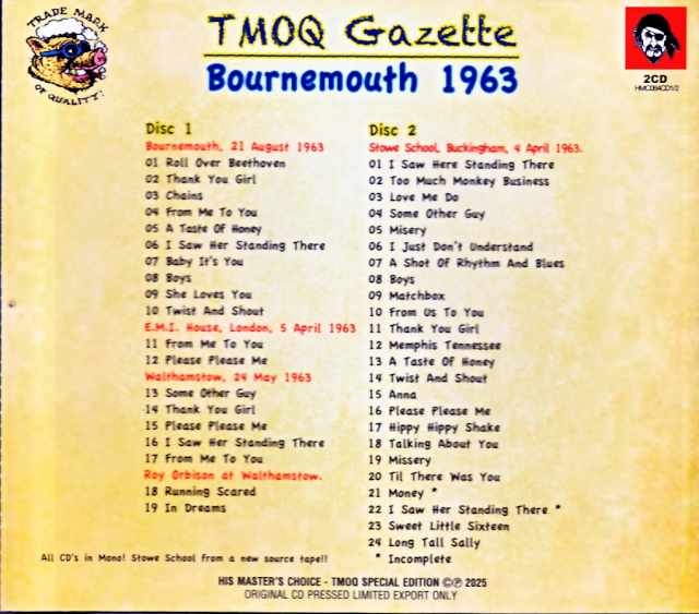 Bournemouth, 23 August 1963, Walthamstow, 24 May 1963, London, EMI House, 5 April 1963, Buckingham, 4 April 1963 Disc 1Bournemouth, 23 August 1963 01. Roll Over Beethoven/02. Thank You Girl/03. Chains/04. From Me To You/05. A Taste Of Honey/06. I Saw Her Standing There/07. Baby It's You/08. Boys/09. She Loves You/10. Twist And Shout E.M.I. House, London, 5 April 1963 11. from Me To You/12. Please Please Me Walthamstow, 24 May 1963 13. Some Other Guy /14. Thank You Girl/15. Please Please Me/16. I Saw Her Standing There /17. from Me To You/ Roy Orbison at Walthamstow/18. Running Scared/19. In Dreams Disc 2 Stowe School, Buckingham, 4 April 1963 01. I Saw Here Standing There/02. Too Much Monkey Business /03. Love Me Do/04. Some Other Guy/05. Misery/06. I Just Don't Understand/07. A Shot Of Rhythm And Blues/08. Boys/09. Matchbox/10. from Us To You/11. Thank You Girl/12. Memphis Tennessee/13. A Taste Of Honey /14. Twist And Shout /15. Anna/16. Please Please Me /17. Hippy Hippy Shake /18. Talking About You /19. Missery/20. Til There Was You/21. Money * /22. I Saw Her Standing There * /23. Sweet Little Sixteen/24. Long Tall Sally * Incomplete All CD's in Mono! Stowe School from a new source tape!