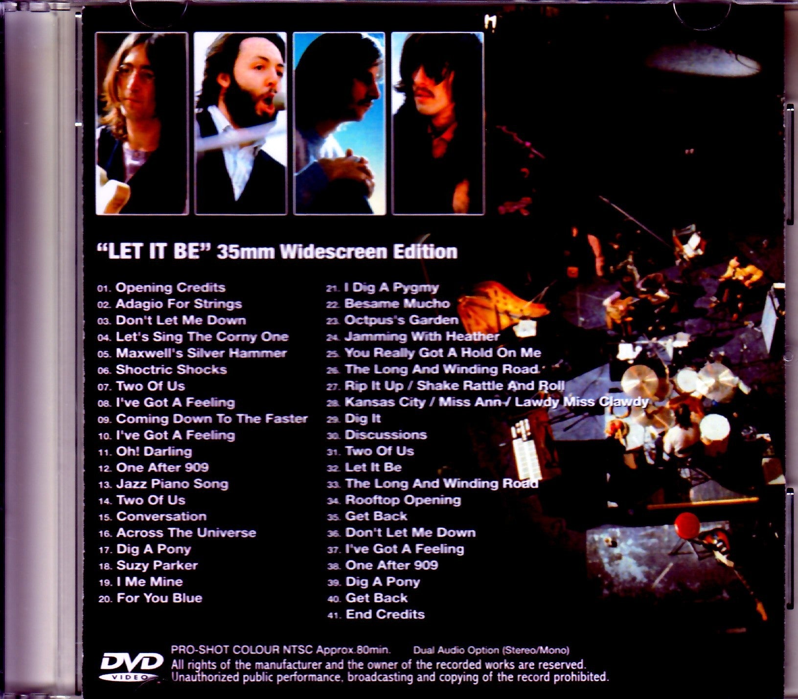 The Beatles' movie "LET IT BE" has finally been confirmed for next year's official release, but what we are delivering this time is the version that was broadcast on BBC TV in 1982. Nowadays, the HMC version of the movie seems to have taken the enthusiast market by storm, but the one shown here was shot on 16mm film and when it was blown up for theatrical release, the top and bottom of the screen were cut off to make it fit for the screen. A combination of cross-sections. It is still rare as an item, but compared to the American laser disc, which had poor image quality and was quickly discontinued, and the Japanese TV broadcast version, the screen size allows for better capture of the left and right sides. The coloring is also more natural. Best of all, the frame fits perfectly on today's widescreen TVs, giving us the impression that it's really easy to see. Although the image quality itself is not as good as that of the HMC, the image spread across the screen size is worth seeing. This BBC broadcast version appeared as part of various versions of the movie ``LET IT BE'' circulating on the internet nearly ten years ago, and at the time it was the best in terms of image quality. It was highly rated by enthusiasts. Furthermore, regarding the audio, it is wonderful that it is not only the original optical monaural audio, but also a combination of stereo sound sources available at the time, and a selection system that records the scenes after Apple Studio in stereo audio as much as possible. However, it does not come with Japanese subtitles like the Japanese Broadcasting version or HMC version, so it may be inferior in that respect. The visual quality is so great that you can recreate the atmosphere when it was released at the theater at home. It seems that it will still be more than a year before the official release of the movie "LET IT BE", which even non-mania fans have been waiting for, so as a stopover until then, we have realized the official release with this DVD. Please lower the amount of alcohol you drink. Dual Audio Option (Stereo/Mono) 1. Opening Credits 2. Adagio For Strings 3. Don't Let Me Down 4. Let's Sing The Corny One 5. Maxwell's Silver Hammer 6. Shoctric Shocks 7. Two Of Us 8. I' ve Got A Feeling 9. Coming Down To The Faster 10. I've Got A Feeling 11. Oh! Darling 12. One After 909 13. Jazz Piano Song 14. Two Of Us 15. Conversation 16. Across The Universe 17. Dig A Pony 18. Suzy Parker 19. I Me Mine 20. For You Blue 21. I Dig A Pygmy 22. Besame Mucho 23. Octpus's Garden 24. Jamming With Heather 25. You Really Got A Hold On Me 26. The Long And Winding Road 27. Rip It Up / Shake Rattle And Roll 28. Kansas City / Miss Ann / Lawdy Miss Clawdy 29. Dig It 30. Discussions 31. Two Of Us 32. Let It Be 33. The Long And Winding Road 34. Rooftop Opening 35. Get Back 36. Don't Let Me Down 37. I've Got A Feeling 38. One After 909 39. Dig A Pony 40. Get Back 41. End Credits PRO-SHOT COLOR NTSC Approx.80min.