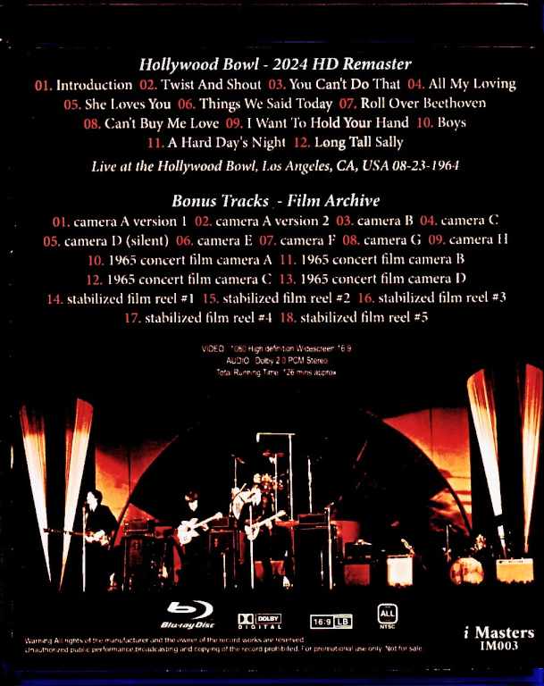 01. Introduction 02. Twist And Shout 03. You Can't Do That 04. All My Loving 05. She Loves You 06. Things We Said Today 07. Roll Over Beethoven 08. Can't Buy Me Love 09. I Want To Hold Your Hand 10. Boys 11. A Hard Day's Night 12. Long Tall Sally Live at the Hollywood Bowl, Los Angeles, CA, USA 08-23-1964 Film Archive 01. camera A version 1 02. camera A version 2 03. camera B 04. camera C 05. camera D (silent) 06. camera E 07. camera F 08. camera G 09. camera H 10. 1965 concert film camera A 11. 1965 concert film camera B 12. 1965 concert film camera C 13. 1965 concert film camera D 14. stabilized film reel #1 15. stabilized film reel #2 16. stabilized film reel #3 17. stabilized film reel #4 18. stabilized film reel #5