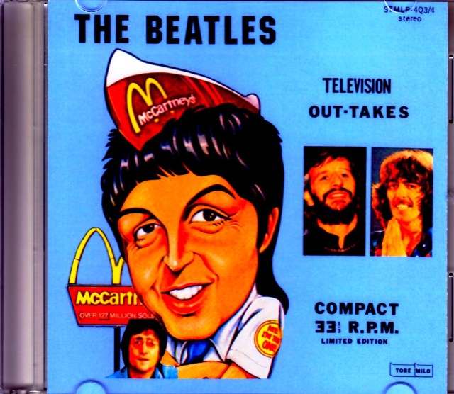 Another Tobe Milo release that will surely bring tears to the eyes of Beatles enthusiasts is "TELEVISION OUT-TAKES". It ranks among the rarest of Tobe Milo releases. At one time, it was common for EPs to sell for over 20,000 yen, and although things have calmed down now, they still sell for well over 10,000 yen, so their popularity has not waned. The most attractive thing about the album is the artwork. Despite the large image of Paul dressed as a McDonald's employee, it has a twisted concept of not having a single song by him (although strictly speaking, his singing voice can be heard in the Ed Sullivan part). Moreover, the cover is printed in full color, which makes it stand out. As for the contents, of course, there was no way that outtakes from television broadcasts would have been leaked in this era, so this is a compilation of audio from television programs in the mid-70s in which members other than Paul appeared. The opening part of Ringo's appearance on the Smothers Brothers show, "No No Song," can currently be seen on YouTube, but the opening comedy part is not available, so it is valuable. Even just from the audio, you can enjoy the role of "a pop star from the 60s." Also, "A SALUTE TO SIR LEW GRADE," John's last TV appearance, and "SATURDAY NIGHT LIVE," in which George performed with Paul Simon, are now easily available, but the recordings here were each recorded from a TV speaker at the time of broadcast, and of course the sound quality is full of vintage feel. However, it is valuable that the "atmosphere" unique to the time of broadcast is conveyed from there. And both sides A and B also contain Beatles-related audio. Side A contains a digest of The Beatles' appearance on the Sullivan Show, which was broadcast at the time of Ed Sullivan's death. The last track on side B, "SECOND OPEN-END INTERVIEW," was made for radio stations to coincide with the release of "BEATLES' SECOND ALBUM" in the United States. It was an interview disc that contained only the Beatles' answers to questions. In other words, if the station's DJ played this and asked a question (the question was printed on the back of the promo disc), the Beatles' interview could be broadcast. It seems like a fake system now (lol), but at the time it was a seriously considered means of promotion. Finally, although the range was not as drastic as "STUDIO OUTTAKES," there was still some variation in pitch depending on the source, so I adjusted it properly here as well (I reduced the scratch noise on both items). This is an excellent CD that allows you to easily enjoy Tobe Milo's rare EP, which Beatles analog enthusiasts would have longed for, with stable pitch. Taken from the original 7" single (TOBE MILO, STMLP-4Q 3/4) (21:14) Side 1 Ringo On The Smother's Brother's Show 1. Intro And Jokes 2. No No Song 3. More Jokes John From "Salute To Sir Lew Grade" TV Special 4. Slippin And Sliding Ed Sullivan Memorial TV Special 5. "And The Roof Almost Come Down When..." Side 2 George & Paul Simon On Saturday Night Live 6. Intro 7. Here Comes The Sun 8. Homeward Bound 9. Interview Open End