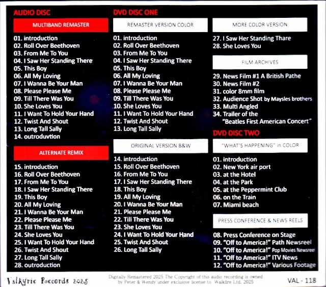 AUDIO DISC MULTIBAND REMASTER 01. introduction 02. Roll Over Beethoven 03. From Me To You 04. I Saw Her Standing There 05. This Boy 06. All My Loving 07. I Wanna Be Your Man 08. Please Please Me 09. Till There Was You 10. She Loves You 11. I Want To Hold Your Hand 12. Twist And Shout 13. Long Tall Sally 14. outroduvtion ALTERNATE REMIX 15. introduction 16. Roll Over Beethoven 17. From Me To You 18. I Saw Her Standing There 19. This Boy 20. All My Loving 21. I Wanna Be Your Man 22. Please Please Me 23. Till There Was You 24. She Loves You 25. I Want To Hold Your Hand 26. Twist And Shout 27. Long Tall Sally 28. outroduction DVD DISC ONE REMASTER VERSION COLOR 01. introduction 02. Roll Over Beethoven 03. From Me To You 04. I Saw Her Standing There 05. This Boy 06. All My Loving 07. I Wanna Be Your Man 08. Please Please Me 09. Till There Was You 10. She Loves You 11. I Want To Hold Your Hand 12. Twist And Shout 13. Long Tall Sally ORIGINAL VERSION B&W 14. introduction 15. Roll Over Beethoven 16. From Me To You 17. I Saw Her Standing There 18. This Boy 19. All My Loving 20. I Wanna Be Your Man 21. Please Please Me 22. Till There Was You 23. She Loves You 24. I Want To Hold Your Hand 25. Twist And Shout 26. Long Tall Sally MORE COLOR VERSION 27. I Saw Her Standing Thare 28. She Loves You FILM ARCHIVES 29. News Film #1 A British Pathe 30. News Film #2 31. color 8mm film 32. Audience Shot by Maysles brothers 33. Multi Angled 34. Trailer of the“Beatles First American Concert” “WHAT’S HAPPENING” in COLOR 01. introduction 02. New York air port 03. at the Hotel 04. at the Park 05. at the Peppermint Club 06. on the Train 07. Miami beach PRESS CONFERENCE & NEWS REELS 08. Press Conference on Stage 09. ”Off to America!” Path Newsreel 10. ”Off to America!” Pop Movies Newsreel 11. ”Off to America!” ITV News 12. ”Off to America!” Various Footage