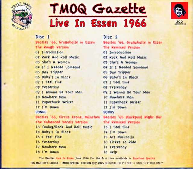 "Live in Essen 1966" is the latest release from a label that's attracting worldwide attention from Beatles collectors! It features two completely new soundboard versions of the 1966 Essen, Germany concert, as well as bonus remixes of the 1966 Munich concert and the 1965 Blackpool Night Out. This must-have title from an international Beatles label is here! This release features the complete soundboard recording of the June 25th Essen, Germany concert, from the 1966 Germany tour, which took place just before the now-legendary Japan concert. While the 1966 Germany concert is best known for its TV broadcast of the Munich concert the day before, it remains in an edited and incomplete form. Until now, only two performances in Japan have recorded the 1966 concert in its entirety on soundboard. This newly discovered Essen concert, featuring a complete soundboard recording, is finally here! Previously only available as a poor-quality audience recording, the Essen performance has been completely recorded on soundboard audio, from the opening "Rock 'n' Roll Music" to the closing "I'm Down," just like the Japanese performance. This is a remarkable new live recording reference, completely unearthed for the first time. The Essen performance is recorded in two versions: "The Rough Version" (originally recorded as is) and "The Remixed Version" (restored with the latest restoration). Bonus features include "The Enhanced Vocal Version" of six surviving tracks from the Munich TV broadcast and a "Remixed Version" of the 1965 UK TV broadcast of "Blackpool Night Out." The release of a new, complete soundboard recording from The Beatles' final 1966 tour is a remarkable achievement, and the latest release from a label that collectors will love! Soundboard Live in Grugahalle, Essen, Germany 1966 + Circus Krone, Munich, Germany 1966 + Blackpool Night Out 1965 Disc 1 Beatles '66, Grugahalle in Essen The Rough Version 01 Introduction 02 Rock And Roll Music 03 She's A Woman 04 If I Needed Someone stereo 05 Day Tripper 06 Baby's In Black 07 I Feel Fine 08 Yesterday 09 I Wanna Be Your Man 10 Nowhere Man 11 Paperback Writer 12 I'm Down BONUS Beatles '66, Circus Krone, Munchen The Enhanced Vocals Version 13 Tuning/Rock And Roll Music 14 Baby's In Black 15 I Feel Fine 16 Yesterday 17 Nowhere Man 18 I'm Down Disc 2 Beatles '66, Grugahalle in Essen The Remixed Version 01 Introduction 02 Rock And Roll Music 03 She's A Woman 04 If I Needed Someone stereo 05 Day Tripper 06 Baby's In Black 07 I Feel Fine 08 Yesterday 09 I Wanna Be Your Man 10 Nowhere Man 11 Paperback Writer 12 I'm Down BONUS Beatles '65 Blackpool Night Out The Remixed Version 13 I Feel Fine 14 I'm Down 15 Act Naturally/ 16 Ticket To Ride 17 Yesterday 18 Help