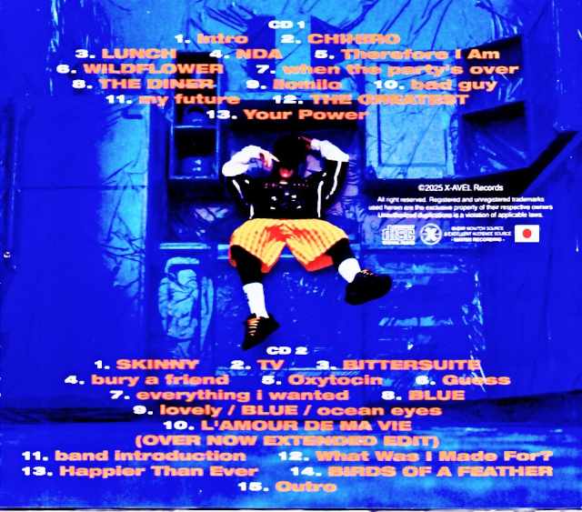 Live at Saitama Super Arena, Saitama, Japan 16th August 2025 : ORIGINAL MASTER : Multiple Stereo IEM Matrix Recording / Original HQ. Audience Shot Disc 1 : 01. Intro 02. CHIHIRO 03. LUNCH 04. NDA 05. Therefore I Am 06. WILDFLOWER 07. when the party's over 08. THE DINER 09. ilomilo 10. bad guy 11. my future 12. THE GREATEST 13. Your Power Disc 2 : 01. SKINNY 02. TV 03. BITTERSUITE 04. bury a friend 05. Oxytocin 06. Guess(Charli xcx cover) 07. everything i wanted 08. BLUE 09. lovely / BLUE / ocean eyes 10. L'AMOUR DE MA VIE(OVER NOW EXTENDED EDIT) 11. band introduction 12. What Was I Made For? 13. Happier Than Ever 14. BIRDS OF A FEATHER 15. Outro DVD : 01. Intro 02. CHIHIRO 03. LUNCH 04. NDA 05. Therefore I Am 06. WILDFLOWER 07. when the party's over 08. THE DINER 09. ilomilo 10. bad guy 11. my future 12. THE GREATEST 13. Your Power 14. SKINNY 15. TV 16. BITTERSUITE 17. bury a friend 18. Oxytocin 19. Guess(Charli xcx cover) 20. everything i wanted 21. BLUE 22. lovely / BLUE / ocean eyes 23. L'AMOUR DE MA VIE(OVER NOW EXTENDED EDIT) 24. band introduction 25. What Was I Made For? 26. Happier Than Ever 27. BIRDS OF A FEATHER 28. Outro