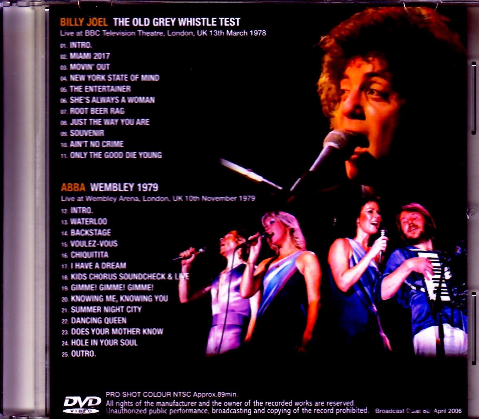 1. Intro 2. Miami 2017 3. Movin' Out 4. New York State Of Mind 5. The Entertainer 6. She's Always a Woman 7. Root Beer Rag 8. Just the Way You Are 9. Souvenir 10. Ain't No Crime 11. Only the Good Die Young ABBA Wembley 1979 Live at Wembley Arena, London, UK 10th November 1979 12. Intro 13. Waterloo 14. Backstage 15. Voulez-Vous 16. Chiquitita 17. I Have A Dream 18. Kids Chorus Soundcheck & Live 19. Gimme! Gimme! Gimme! 20. Knowing Me, Knowing You 21. Summer Night City 22. Dancing Queen 23. Does Your Mother Know 24. Hole In Your Soul 25. Outro PRO-SHOT COLOR NTSC Approx.89min.