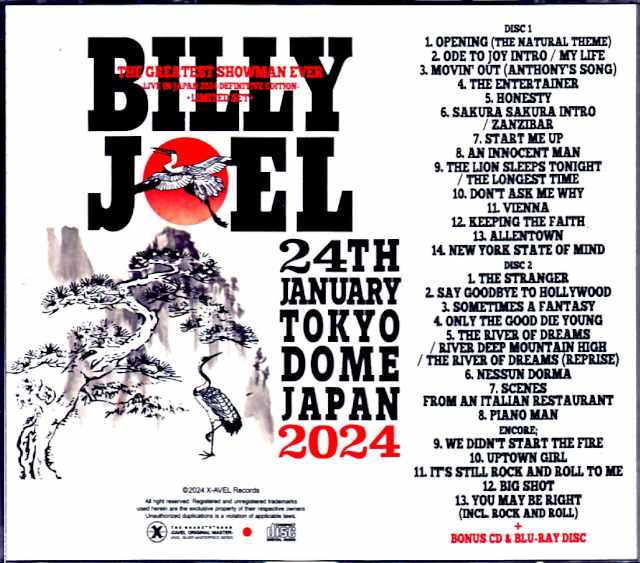 Disc 1 01. Opening (The Natural Theme) 02. Ode To Joy Intro / My Life 03. Movin' Out (Anthony's Song) 04. The Entertainer 05. Honesty 06. Sakura Sakura Intro / Zanzibar 07. Start Me Up 08. An Innocent Man 09. The Lion Sleeps Tonight / The Longest Time 10. Don't Ask Me Why 11. Vienna 12. Keeping The Faith 13. Allentown 14. New York State Of Mind Disc 2 01. The Stranger 02. Say Goodbye To Hollywood 03. Sometimes A Fantasy 04. Only The Good Die Young 05. The River Of Dreams / River Deep Mountain High / The River Of Dreams (Reprise) 06. Nessun Dorma 07. Scenes From An Italian Restaurant 08. Piano Man Encore; 09. We Didn't Start The Fire 10. Uptown Girl 11. It's Still Rock And Roll To Me 12. Big Shot 13. You May Be Right (incl. Rock And Roll) Blu-ray Disc 01. Opening (The Natural Theme) 02. Ode To Joy Intro / My Life 03. Movin' Out (Anthony's Song) 04. The Entertainer 05. Honesty 06. Zanzibar (with Sakura Sakura Intro) 07. Start Me Up 08. An Innocent Man 09. The Lion Sleeps Tonight / The Longest Time 10. Don't Ask Me Why 11. Vienna 12. Keeping The Faith 13. Allentown 14. New York State of Mind 15. The Stranger 16. Say Goodbye To Hollywood 17. Sometimes A Fantasy 18. Only The Good Die Young 19. The River Of Dreams / River Deep Mountain High / The River Of Dreams (Reprise) 20. Nessun Dorma 21. Scenes From An Italian Restaurant 22. Piano Man Encore; 23. We Didn't Start The Fire 24. Uptown Girl 25. It's Still Rock And Roll To Me 26. Big Shot 27. You May Be Right (incl. Rock And Roll) Bonus CD Soundcheck rehearsal at Tokyo Dome, Tokyo, Japan 24th January 2024
