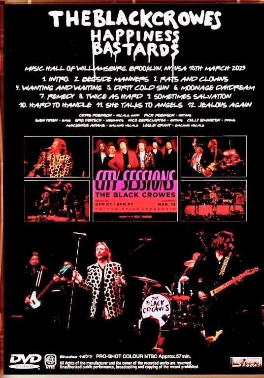 Album release party "Happiness Bastards" : at Music Hall of Williamsburg, Brooklyn, NY, USA 15th March 2024 / PRO-SHOT COLOUR NTSC Approx.57min 1. Intro 2. Bedside Manners 3. Rats And Clowns 4. Wanting And Waiting 5. Dirty Cold Sun 6. Moonage Daydream 7. Remedy 8. Twice As Hard 9. Sometimes Salvation 10. Hard To Handle 11. She Talks To Angels 12. Jealous Again Chris Robinson - Vocals, Harp / Rich Robinson - Lead Guitar / Sven Pipien – Bass / Erik Deutsch – keyboards / Nico Bereciartua – guitars / Cully Symington – drums / Mackenzie Adams - backing vocals / Lesley Grant - backing vocals