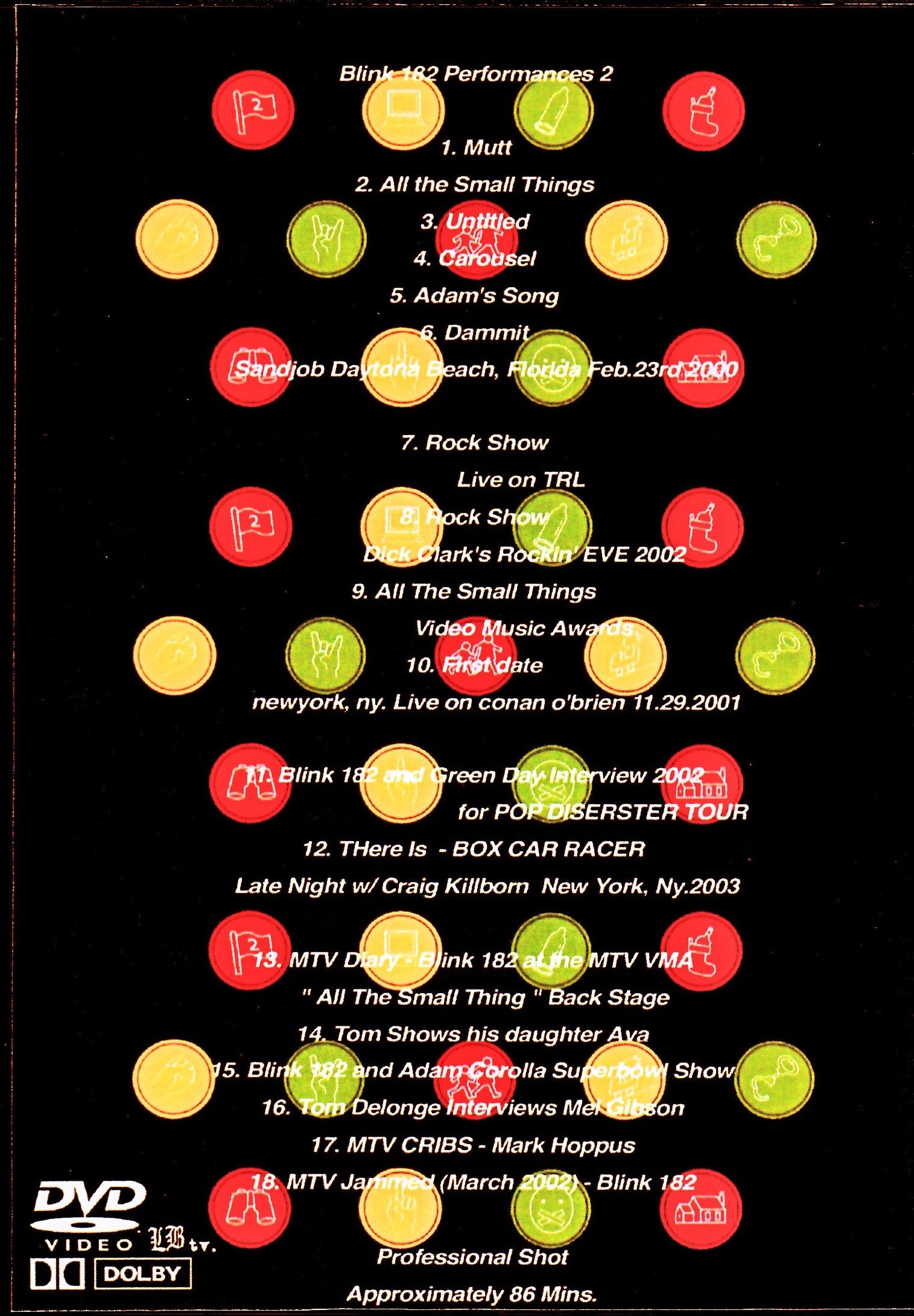 01. Mutt 02. All the Small Things 03. CAROUSEL 05. Adam's Song 06. Dammit Dick Clark's Rockin 'Eve 2002 07. ROCK SHOW VIDEO MUSIC 08. All the Small Things Conan O'Brien 2001 09. First Date 11. BLINK 182 & GREENDAY - INTERVIEW FROM POP DISASTER TOUR 2002 CRAIG KILBORN SHOW 2003 12. THERE IS - BOX CAR RACER 13. MTV DIALY BLINK 182 AT THE VMA BACK STAGE OF "ALL THE SMALL THINGS" 14. TOM SHOWS HIS DOUGHTER AVA 15. BLINK 182 & ADAM COROLLA SUPERBOWL SHOW 16. TOM DELONGE INTERVIEWS MEL GIBSON 17. MTV CRIBS - MARK HOPPUS 18. MTV JAMMED (MARCH 2002) Recording time: 86 minutes Number of discs: 1 Source: Proshot Image quality: AA Sound quality: A.A.