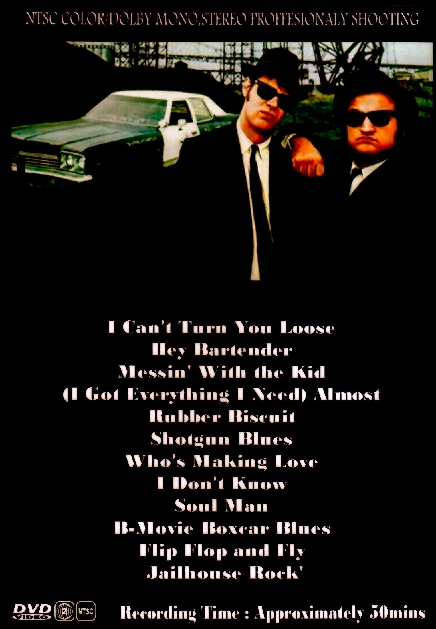 The Blues Brothers are a duo formed by two popular TV stars, John Belushi and Dan Arkroyd, who wanted to give it a try. We have recorded a professional shot of their live performance in California in 1979. The recording time is 50 minutes with menu chapter specifications. I Can't Turn You Loose Hey Bartender Messin' With the Kid (I Got Everything I Need) Almost Rubber Biscuit Shotgun Blues Who's Making Love I Don't Know Soul Man B-Movie Boxcar Blues Flip Flop and Fly Jailhouse Rock' Live In Los Angeles, CA 09-06-1979 DVD DVD Format: NTSC Source: Pro-Shot (Multi Camera) Video Quality: Rating: 7.8 Menus: Yes Chapter Selection: Every 5 Min. Fullscreen: Yes HD: No Total Running Time: 50 Min.