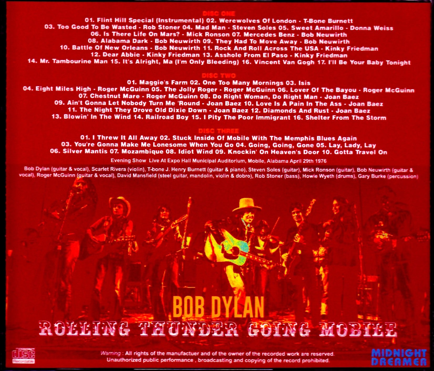 DISC ONE 01. Flint Hill Special (Instrumental) 02. Werewolves Of London - T-Bone Burnett 03. Too Good To Be Wasted - Rob Stoner 04. Mad Man - Steven Soles 05. Sweet Amarillo - Donna Weiss 06. Is There Life On Mars? - Mick Ronson 07. Mercedes Benz - Bob Neuwirth 08. Alabama Dark - Bob Neuwirth 09. They Had To Move Away - Bob Neuwirth 10. Battle Of New Orleans - Bob Neuwirth 11. Rock And Roll Across The USA - Kinky Friedman 12 . Dear Abbie - Kinky Friedman 13. Asshole From El Paso - Kinky Friedman 14. Mr. Tambourine Man 15. It's Alright, Ma (I'm Only Bleeding) 16. Vincent Van Gogh 17. I'll Be Your Baby Tonight DISC TWO 01. Maggie's Farm 02. One Too Many Mornings 03. Isis 04. Eight Miles High - Roger McGuinn 05. The Jolly Roger - Roger McGuinn 06. Lover Of The Bayou - Roger McGuinn 07. Chestnut Mare - Roger McGuinn 08. Do Right Woman , Do Right Man - Joan Baez 09. Ain't Gonna Let Nobody Turn Me 'Round - Joan Baez 10. Love Is A Pain In The Ass - Joan Baez 11. The Night They Drove Old Dixie Down - Joan Baez 12. Diamonds And Rust - Joan Baez 13. Blowin' In The Wind 14. Railroad Boy 15. I Pity The Poor Immigrant 16. Shelter From The Storm DISC THREE 01. I Threw It All Away 02. Stuck Inside Of Mobile With The Memphis Blues Again 03. You're Gonna Make Me Lonesome When You Go 04. Going, Going, Gone 05. Lay, Lady, Lay 06. Silver Mantis 07. Mozambique 08. Idiot Wind 09. Knockin' On Heaven's Door 10. Gotta Travel On Evening Show Live At Expo Hall Municipal Auditorium, Mobile, Alabama April 29th 1976