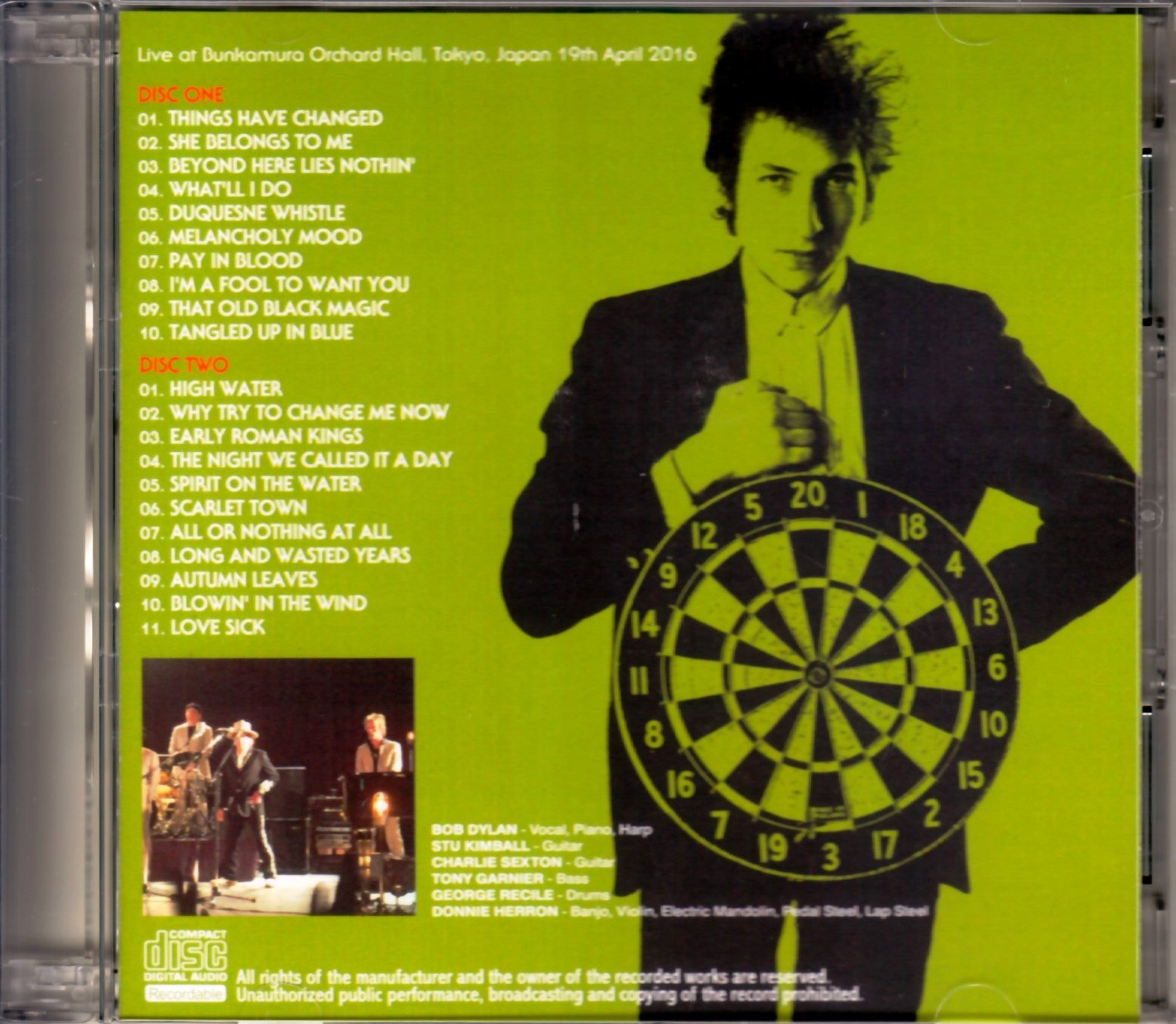 Bob Dylan has been making his singing voice resonate throughout Japan for a total of 16 performances over the course of about a month. Finally, all that remains is the Yokohama performance on the final day. This week's gift is a superb live album from April 19, 2016, the 10th performance of the Japan tour (5th performance in Tokyo). This tour is currently in progress, but let's briefly summarize it so you can get an idea of it. ・April 4th-6th: Orchard Hall, Tokyo (3 performances) ・April 9th: Sendai (1 performance) ・April 11th-13th: Osaka (3 performances) ・April 15th: Nagoya ( 1 performance) ★April 18th-23rd: Tokyo, Orchard Hall (4 performances), April 23rd: Tokyo, TOKYO DOME CITY HALL (1 performance), April 25th-26th: Tokyo, Orchard Hall ( 2 performances) April 28th: Pacifico Yokohama (1 performance) The recently released "TOKYO 2016 3RD NIGHT" has also been very well received, but this is the last day of the 3-day tour at Orchard Hall. This work captures the timing of his return to Tokyo after traveling around Sendai, Osaka, and Nagoya. This is the second time. The best part of this work is the sound. “TOKYO 2016 3RD NIGHT” was also a miraculous recording, but this work is also a superb audience album. The master directly handed down to him by the recording artist himself, who has worked on numerous masterpieces, is used directly, and the neat and fresh sound is breathtakingly wonderful. Dylan's singing voice plunges straight through the transparent space of Orchard Hall, and even his breathing is delicately recorded, and the brushy drumming is as real as if you could touch it with your hands. When you pick up the guitar, you can almost hear not only the nuances of the cutting, but also the sound of the strings rubbing. Although it is a sound that stands out clearly, it is still delicious because it is completely different from the inorganic texture of a sound board. The sound was as transparent as crystal glass, yet the elegant echoes of Orchard Hall were subtly enveloping it, and the applause gently fell like autumn rain. It is definitely ``raw'' and ``real'', but the fleshiness of these words is unbecomingly gentle and transparent, and above all, it is ``beautiful''. This beauty can only be realized when "the latest digital equipment", "acoustics of a famous hall", "techniques of a famous recording artist", and "Dylan's singing voice"... all of them come together. It is one that spits out plenty of that from the speaker. Live at Bunkamura Orchard Hall, Tokyo, Japan 19th April 2016 TRULY PERFECT SOUND(from Original Masters) Disc 1(46:14) 1. Things Have Changed 2. She Belongs to Me 3. Beyond Here Lies Nothin' 4. What'll I Do 5. Duquesne Whistle 6. Melancholy Mood 7. Pay in Blood 8. I'm a Fool to Want You 9. That Old Black Magic 10. Tangled Up in Blue Disc 2(57:17) 1. High Water (For Charley Patton) 2. Why Try to Change Me Now 3. Early Roman Kings 4. The Night We Called It a Day 5. Spirit on the Water 6. Scarlet Town 7. All or Nothing at All 8. Long and Wasted Years 9. Autumn Leaves 10. Blowin' in the Wind 11. Love Sick