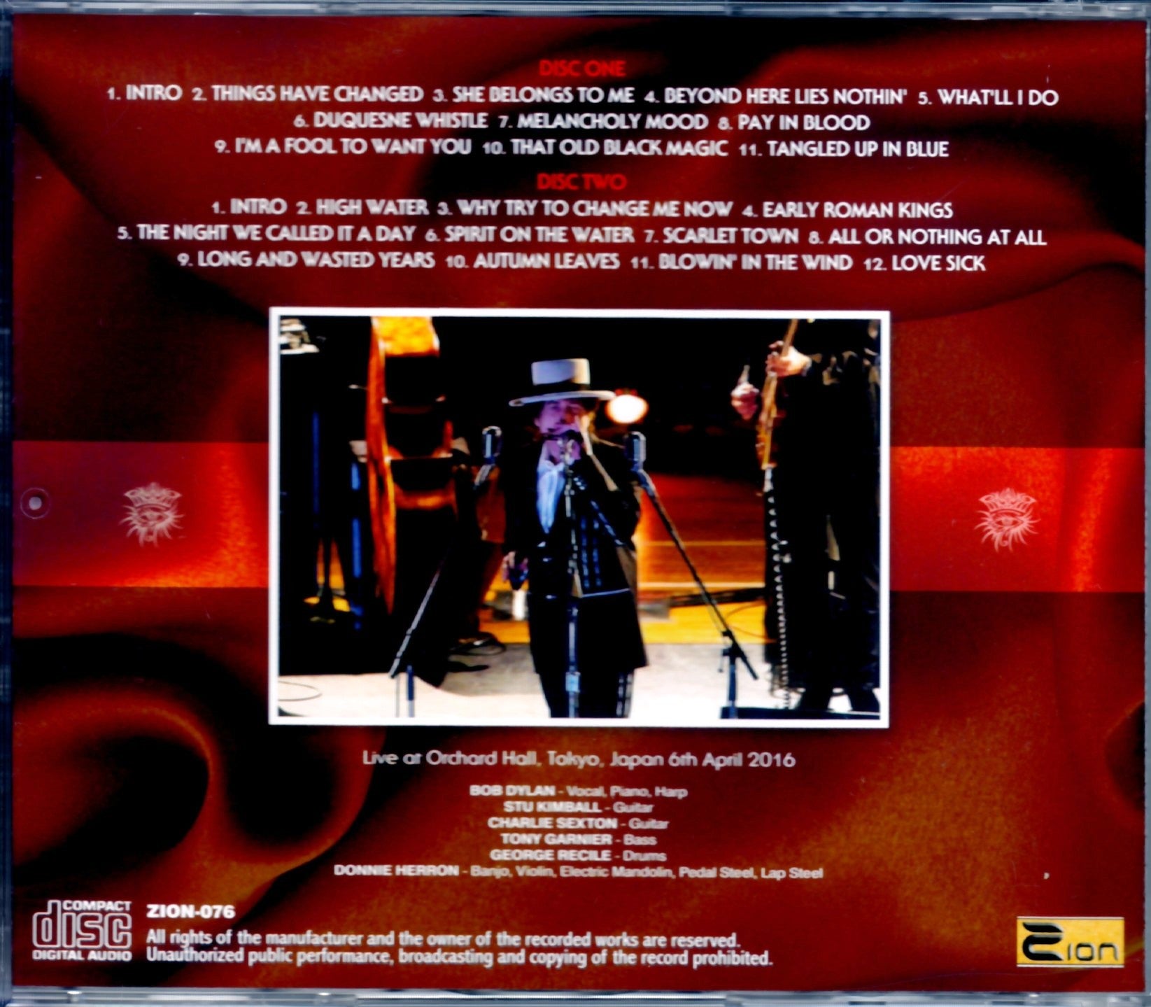 The first release from Bob Dylan's Japan tour, which has been going on for almost a month, is finally here. Although this visit to Japan is the first live performance of this year for Dylan and the band, the latest tour has already caused a reaction among enthusiasts all over the world with their high-quality live performances day after day. If it is released from there, there is no doubt that it will be an attention-grabbing item that even non-Dylan fans can't miss. For its release, we used an audience recording master that was provided directly by Taper, without going through traders or the internet, which was captured live at Shibuya Orchard Hall in Tokyo on April 7th, the third performance in Japan. In 2016, where recording at the highest quality is considered commonplace, the sound quality of this uniquely sourced sound source can be described as top class. The balance of each instrument in the performance, and the volume of Dylan's voice in the background. Advances in equipment and technology have made it possible for audience recordings in recent years to produce recordings that have a natural sound image and amazing clarity, but when it comes to the balance of instruments, the volume and presence of the drums are pushed out. There are many cases where this happens. In that respect, this recording is free from the imbalance of instruments that recent audience recordings sometimes tend to fall into, and it captures Dylan's latest stage in a state that is worthy of being called a superb recording. . Dylan's latest live sound sources will probably be released in the future, but I assure you that this album has the quality that should serve as a guideline for them! Since 2013, Dylan's live shows have switched to a setlist composition centered on recent albums, and the song selection has hardly changed to this day. However, during the last tour in 2014, one or two songs changed almost every day, surprising enthusiasts around the world. This performance in Japan will not only be the first performance in Japan since the release of Frank Sinatra's cover collection "SHADOWS IN THE NIGHT", which was a huge hit last year, but will also be released as a sequel to the Sinatra covers. The set list, which includes songs from ``FALLEN ANGELS'' and ``MELANCHOLY MOOD'', which was released as a pre-release single in Japan, has been a hot topic among enthusiasts all over the world. Therefore, although the song selection did not change as much as last time, the high-quality performance had my ears glued to it. The splendid stage performance of the Sinatra cover from last year's tour had already become a hot topic, but among the songs from the singles added this time, the lively performance of the title song in particular was a splendid accent in the first half of the live performance. You can feel from this sound source that the audience is excited. Furthermore, in the Japanese performance, Dylan's magnificent singing performance of "That Old Black Magic", which was set in from the live show on the 6th the previous day, was also wonderful. This day's live performance was the third day of the three consecutive days since he came to Japan, and one of the repeat audience members said, ``I noticed the lack of clarity in Dylan's voice in the first half.'' There were some reports about this, but since Dylan's current standard is high-quality performance as a whole, when you listen to it like this, the voltage hasn't dropped at all, and the sound is surprisingly strong. I'm surprised. Rather, the really rare incident that the band's breathing becomes disrupted several times during "Long And Wasted Years" at the end of the live performance is more conspicuous. After all, it is the current Dylan band that boasts a stable or rock-solid performance, so it is no exaggeration to say that this is rather interesting to listen to, and is one of the highlights of the day. By the way, there are also live sounds that are unique to 2016, such as "Duquesne Whistle", which has evolved into a jazzier and harder arrangement even though it is a traditional repertoire, and a rock performance of "Love Sick", which has been elevated to the role of closing the entire live performance. There is no doubt that you will thoroughly enjoy it due to its high sound quality. This is the appearance of the best sound source that will be overwhelmed by the hot stage unique to Dylan, such as the moist performance of Sinatra cover and the passionate singing of Dylan, who has now become a complete singer. The rock-solid, high-quality performance of the members who have been backing for many years, Dylan singing carefully, and the recording quality that anyone from beginners to enthusiasts can listen to with confidence.The title combines all of these, and the words "genuine top-notch" say it all... . Live at Orchard Hall, Tokyo, Japan 6th April 2016 ULTIMATE SOUND(from Original Masters) Disc 1 (47:26) 1. Intro. 2. Things Have Changed 3. She Belongs To Me 4. Beyond Here Lies Nothin' 5. What 'll I Do 6. Duquesne Whistle 7. Melancholy Mood 8. Pay In Blood 9. I'm A Fool To Want You 10. That Old Black Magic 11. Tangled Up In Blue Disc 2 (58:27) 1. Intro. 2. High Water 3. Why Try To Change Me Now 4. Early Roman Kings 5. The Night We Called It A Day 6. Spirit On The Water 7. Scarlet Town 8. All Or Nothing At All 9. Long And Wasted Years 10. Autumn Leaves 11. Blowin' In The Wind 12. Love Sick