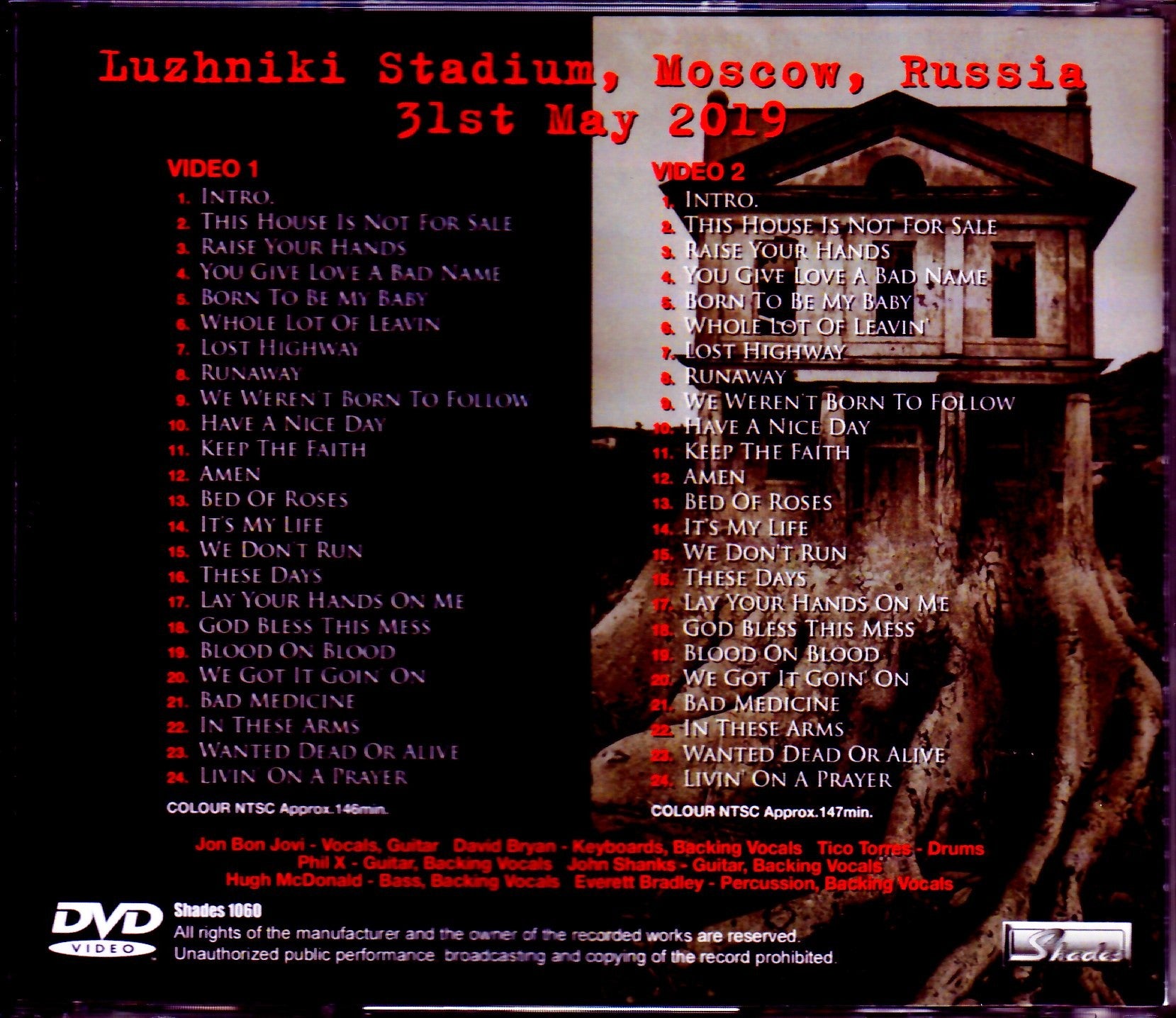 Disc 1(146:07) Video 1 1. Intro 2. This House Is Not for Sale 3. Raise Your Hands 4. You Give Love a Bad Name 5. Born to Be My Baby 6. Whole Lot of Leavin' 7. Lost Highway 8. Runaway 9. We Weren't Born to Follow 10. Have a Nice Day 11. Keep the Faith 12. Amen 13. Bed of Roses 14. It's My Life 15. We Don't Run 16. These Days 17. Lay Your Hands on Me 18. God Bless This Mess 19. Blood on Blood 20. We Got It Goin' On 21. Bad Medicine 22. In These Arms 23. Wanted Dead or Alive 24. Livin' on a Prayer COLOR NTSC Approx. 146min. Disc 2(147:23) Video 2 1. Intro 2. This House Is Not for Sale 3. Raise Your Hands 4. You Give Love a Bad Name 5. Born to Be My Baby 6. Whole Lot of Leavin' 7 . Lost Highway 8. Runaway 9. We Weren't Born to Follow 10. Have a Nice Day 11. Keep the Faith 12. Amen 13. Bed of Roses 14. It's My Life 15. We Don't Run 16. These Days 17. Lay Your Hands on Me 18. God Bless This Mess 19. Blood on Blood 20. We Got It Goin' On 21. Bad Medicine 22. In These Arms 23. Wanted Dead or Alive 24. Livin' on a Prayer COLOR NTSC Approx.147min. Jon Bon Jovi - vocals, guitar David Bryan - keyboards, vocals Tico Torres - drums, percussion, vocals Hugh McDonald - bass guitar, vocals Phil X - guitar, vocals Everett Bradley - percussion, , vocals John Shanks - guitars, vocals COLOR NTSC Approx.293min.(TOTAL)