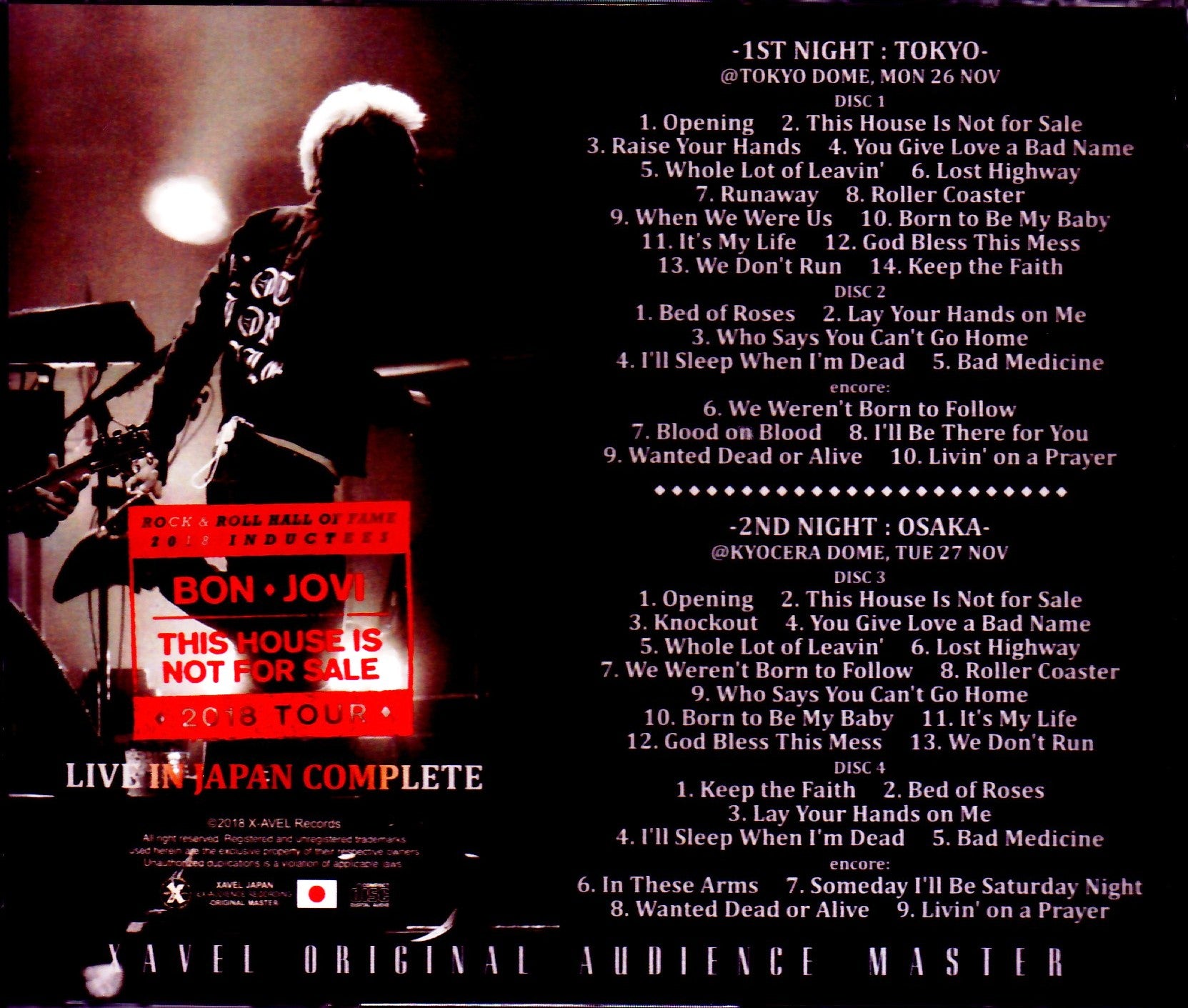 Their first performance in Japan in 5 years in 2018 was one in Tokyo and one in Osaka Dome, and all two performances were recorded as a complete high-quality audience recording. Thanks to the evolution of digital recording equipment in recent years, both have excellent sound with a wide range and perfect quality, making it hard to believe that they were recorded in a dome. Since the tour was in conjunction with the release of "This House Is Not For Sale," there were four songs from the same album on both days, including the opening title number, and "We Don't Run," which was performed for the first time in Japan. And, of course, there was a parade of representative numbers from the past, and since they were performed every day, the order of the songs and the setlist changed considerably.First, the one that only appeared in Tokyo was "Runaway," and then for the encore, "Runaway." Blood on Blood" and "I'll Be There for You" were also performed in a full-volume live performance of 23 songs lasting two and a half hours. On the other hand, the Osaka performance had a set with two fewer songs, but the main part had "Knockout", and the two encore songs "In These Arms" and "Someday I'll Be Saturday Night" were only in Osaka, and as expected on both days. Full of places to listen. Anyway, this is a premier live show that will only be held for these two days, and the set is different, so fans should listen to and carry this limited-edition commemorative item when they come to Japan. Disc 1 : 01. Opening 02. This House Is Not for Sale 03. Raise Your Hands 04. You Give Love a Bad Name 05. Whole Lot of Leavin 06. Lost Highway 07. Runaway 08. Roller Coaster 09. When We Were Us 10. Born to Be My Baby 11. It's My Life 12. God Bless This Mess 13. We Don't Run 14. Keep the Faith Disc 2 : 01. Bed of Roses 02. Lay Your Hands on Me 03. Who Says You Can't Go Home 04. I'll Sleep When I'm Dead 05. Bad Medicine –encore- 06 . We Weren't Born to Follow 07. Blood on Blood 08. I'll Be There for You 09. Wanted Dead or Alive 10. Livin' on a Prayer [Recorded at Tokyo Dome, Tokyo, Japan 26th November 2018] Disc 3 : 01. Opening 02. This House Is Not for Sale 03. Knockout 04. You Give Love a Bad Name 05. Whole Lot of Leavin' 06. Lost Highway 07. We Weren't Born to Follow 08. Roller Coaster 09. Who Says You Can't Go Home 10. Born to Be My Baby 11. It's My Life 12. God Bless This Mess 13. We Don't Run Disc 4 : 01. Keep the Faith 02. Bed of Roses 03. Lay Your Hands on Me 04. I'll Sleep When I'm Dead 05. Bad Medicine –encore- 06. In These Arms 07. Someday I'll Be Saturday Night 08. Wanted Dead or Alive 09. Livin' on a Prayer [Recorded at Kyocera Dome, Osaka, Japan 27th November 2018]