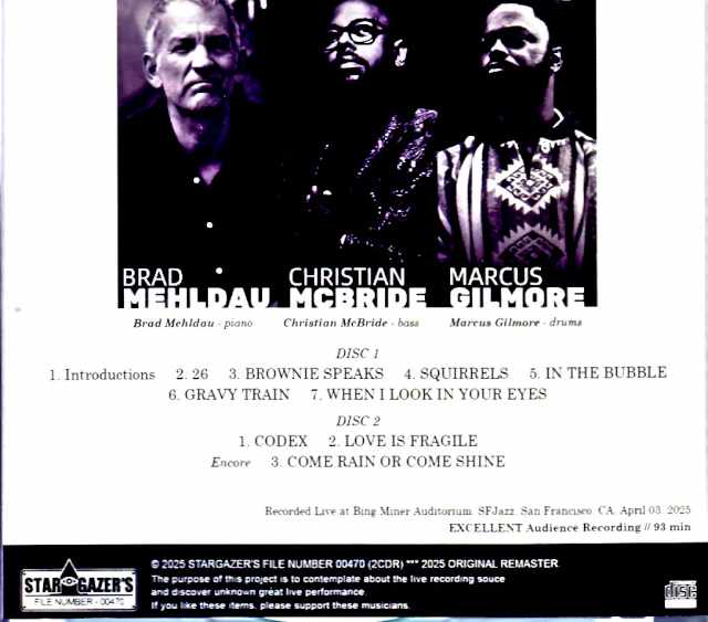 。Recorded at Bing Miner Auditorium, SFJazz, San Francisco, CA, USA April 3rd 2025 : Audience Recording / 2025 Remaster DISC 1 : 1. Introductions 2. 26 3. BROWNIE SPEAKS 4. SQUIRRELS 5. IN THE BUBBLE 6. GRAVY TRAIN 7. WHEN I LOOK IN YOUR EYES DISC 2 : 1. CODEX 2. LOVE IS FRAGILE –encore- 3. COME RAIN OR COME SHINE Brad Mehldau – piano / Christian McBride – bass / Marcus Gilmore - drums