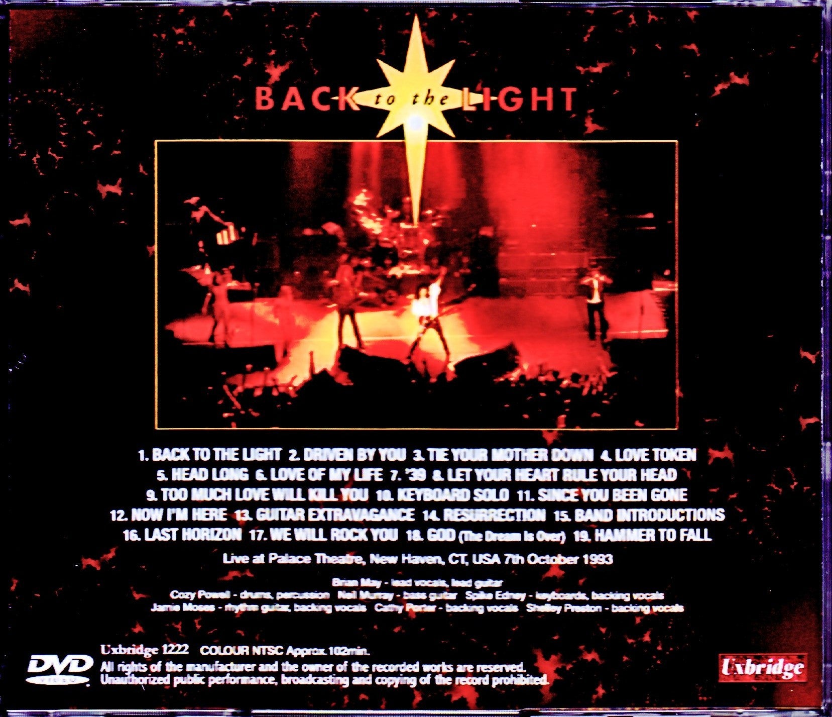 1. Back To The Light 2. Driven By You 3. Tie Your Mother Down 4. Love Token 5. Head Long 6. Love Of My Life 7. '39 8. Let Your Heart Rule Your Head 9. Too Much Love Will Kill You 10. Keyboard Solo 11. Since You Been Gone 12. Now I'm Here 13. Guitar Extravagance 14. Resurrection 15. Band Introductions 16. Last Horizon 17. We Will Rock You 18. God (The Dream Is Over) 19. Hammer To Fall Brian May - Guitar / Vocals Jamie Moses - Guitar Neil Murray - Bass Cozy Powell - Drums Spike Edney - Keyboards Shelley Preston - Vocals Kathy Porter - Vocals COLOUR NTSC Approx.102min.