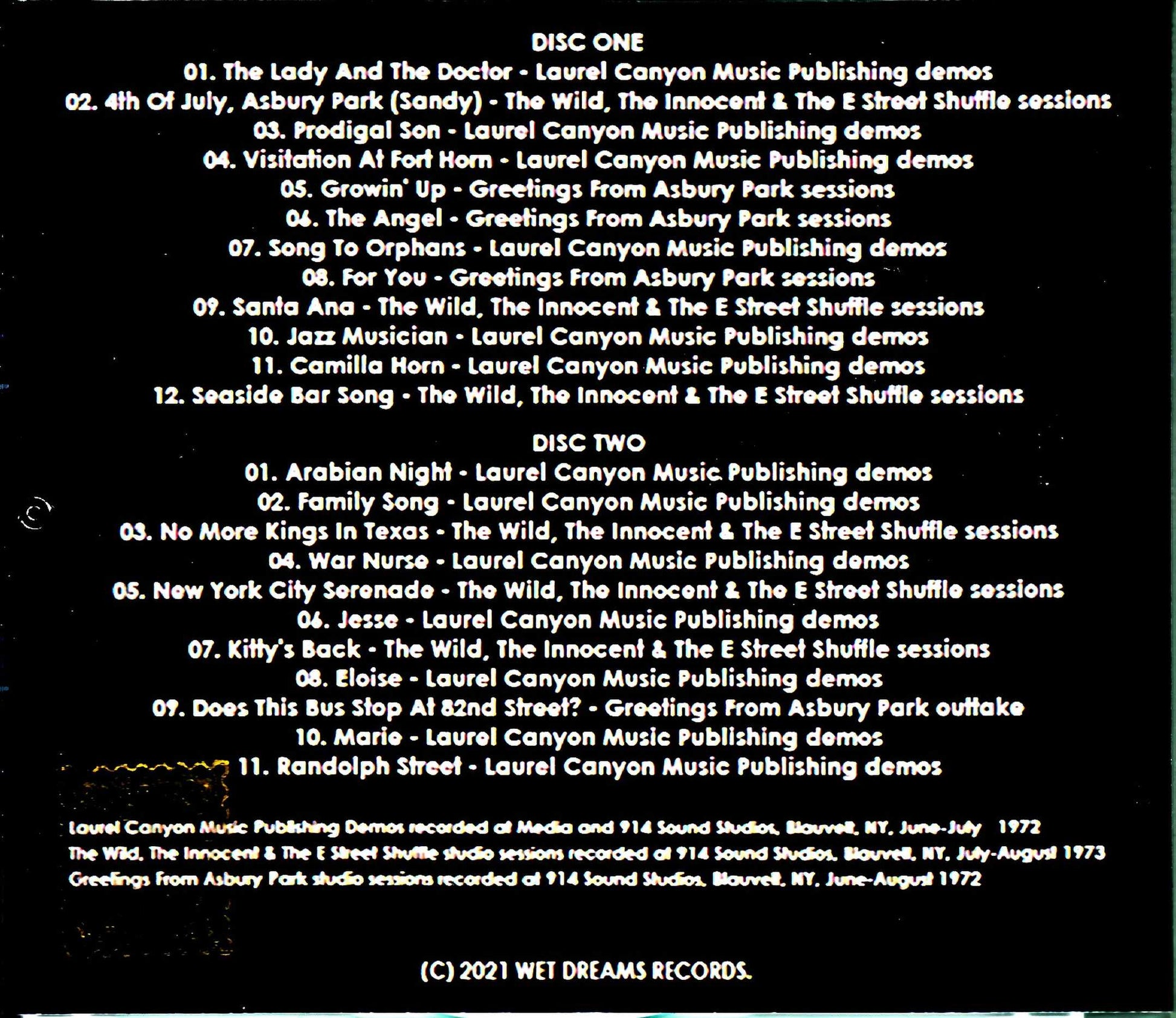 DISC 1 : 01. The Lady And The Doctor - Laurel Canyon Music Publishing demos / 02. 4th Of July, Asbury Park (Sandy) - The Wild, The Innocent & The E Street Shuffle sessions / 03. Prodigal Son - Laurel Canyon Music Publishing demos / 04. Visitation At Fort Horn - Laurel Canyon Music Publishing demos / 05. Growin' Up - Greetings From Asbury Park sessions / 06. The Angel - Greetings From Asbury Park sessions / 07. Song To Orphans - Laurel Canyon Music Publishing demos / 08. For You - Greetings From Asbury Park sessions / 09. Santa Ana - The Wild, The Innocent & The E Street Shuffle sessions / 10. Jazz Musician - Laurel Canyon Music Publishing demos / 11. Camilla Horn - Laurel Canyon Music Publishing demos / 12. Seaside Bar Song - The Wild, The Innocent & The E Street Shuffle sessions DISC 2 : 01. Arabian Night - Laurel Canyon Music Publishing demos / 02. Family Song - Laurel Canyon Music Publishing demos / 03. No More Kings In Texas - The Wild, The Innocent & The E Street Shuffle sessions / 04. War Nurse - Laurel Canyon Music Publishing demos / 05. New York City Serenade - The Wild, The Innocent & The E Street Shuffle sessions 06. Jesse - Laurel Canyon Music Publishing demos / 07. Kitty's Back - The Wild, The Innocent & The E Street Shuffle sessions / 08. Eloise - Laurel Canyon Music Publishing demos / 09. Does This Bus Stop At 82nd Street? - Greetings From Asbury Park outtake / 10. Marie - Laurel Canyon Music Publishing demos / 11. Randolph Street - Laurel Canyon Music Publishing demos
