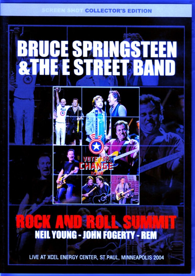 This is a nearly complete two-hour recording of the Minneapolis-Saint-Paul concert on October 5th from the "Vote for Change" tour, in which The Boss appealed for support for the Democratic Party in an anti-Bush stance in the 2004 US presidential election. In addition to REM and John Fogerty, Neil Young also participated on this day, and of course the Boss and Neil performed together, and the last song "Rockin' in the Free World" was a must-see live video for fans, with all the guests participating and getting very excited. Moreover, the fixed camera shooting makes it high quality, so you can see it as if it were a professional shot. 01. BADLANDS/02. NO SURRENDER/03. LONESOME DAY/04. THE RIVER/05. SOULS OF THE DEPARTED (with Neil Young)/06. ALL ALONG THE WATCHTOWER (with Neil Young)/07. JOHNNY 99/08. CENTERFIELD (with John Fogerty)/09. FORTUNATE SON (with John Fogerty)/ 10. THE PROMI SED LAND (with John Fogerty)/11. THE RISING/12. BECAUSE THE NIGHT (with Michael Stipe-REM)/13. MARY'S PLACE/14. BORN TO RUN (with Mike Mills and Peter Buck)/15. PROUD MARY (with John Fogerty)/ 16. ROCKIN' IN THE FREE WORLD (with John Fogerty, Neil Young, REM) BONUS TRACK:17. BAD DAY (with REM)/18. MAN ON THE MOON (with REM) [Live At Xcel Energy Center, St Paul, MN October 5th 2004]