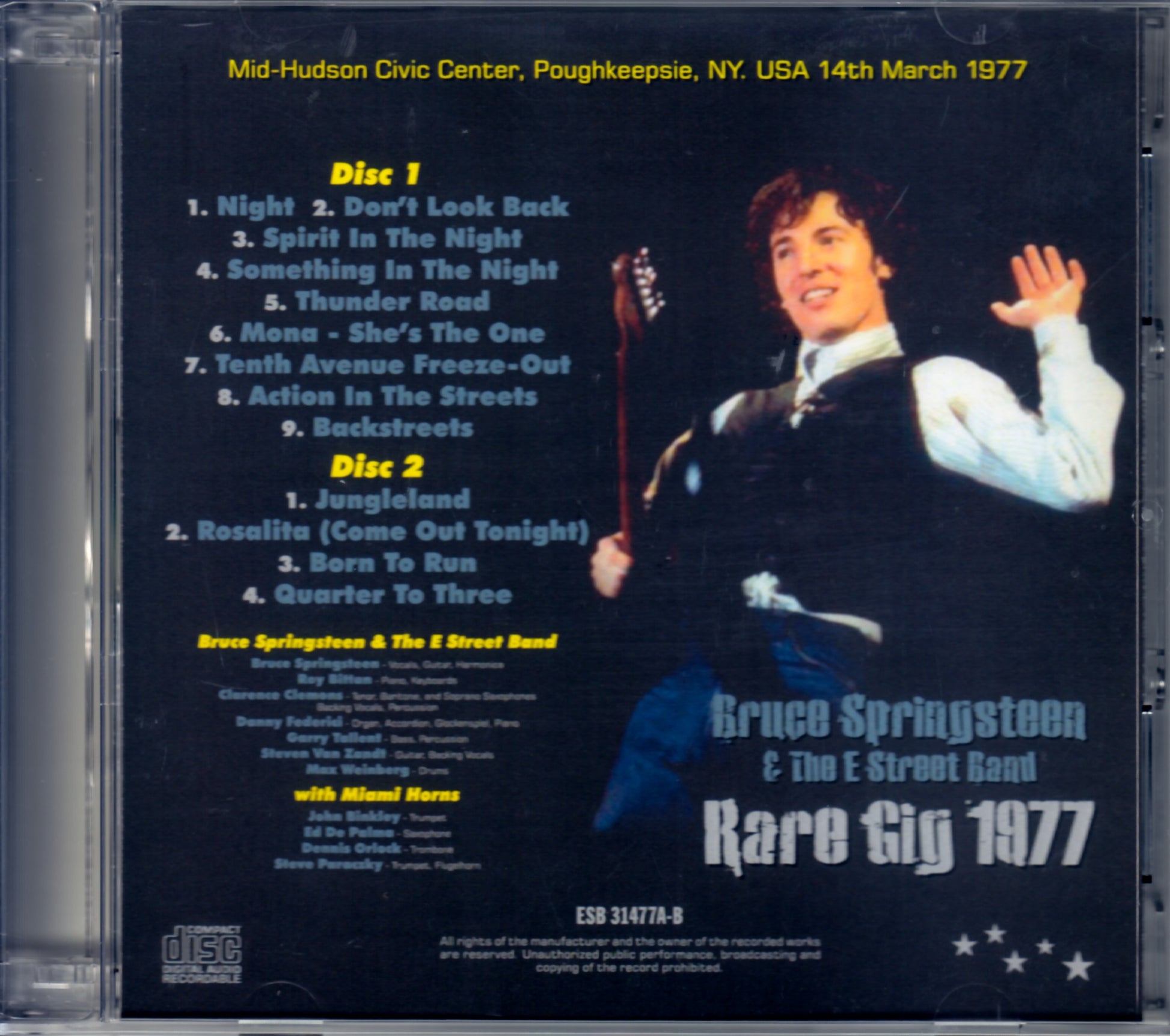 Speaking of the 1977 tour, there was “Something In The Night,” which was played in the first half of the tour, “Action In The Streets,” a live repertoire that was only played on this tour, and “Don’t Look,” which appeared at the end of the tour. The secret to its popularity is that you can listen to rare songs such as "Back". Among them, “Something In?” was played extremely few times on the Darkness Tour, and “Don’t Look?” did not come true to be played on the Darkness Tour. On the contrary, even on the 1977 tour, there were almost no days when all of these songs were played, and the set list changed as the tour progressed. However, the very rare day when all these rare songs are played is the Poughkeepsie performance on March 14th, which was recorded on the “RARE GIG 1977” CD-R. Not only such an attractive set list, but also the calm texture and clearness of the monaural recording recorded from the master cassette will be a rare sound source for enthusiasts around the world. Unfortunately, the lyrics have not been completed yet, and the cut is included in "Don't Look?", which can be called a rare early live version. However, if it is this rare, it is sure to satisfy fans. You can't miss this high-grade item, which can be said to be the missing link of the 1977 tour, by adjusting the pitch and filling the gap between this time's Milwaukee and the classic Boston at the end of the tour! Live at Mid-Hudson Civic Center, Poughkeepsie, NY. USA 14th March 1977 Disc 1(62:02) 1. Night 2. Don't Look Back 3. Spirit In The Night 4. Something In The Night 5. Thunder Road 6 Mona - She's The One 7. Tenth Avenue Freeze-Out 8. Action In The Streets 9. Backstreets Disc 2(39:12) 1. Jungleland 2. Rosalita 3. Born To Run 4. Quarter To Three