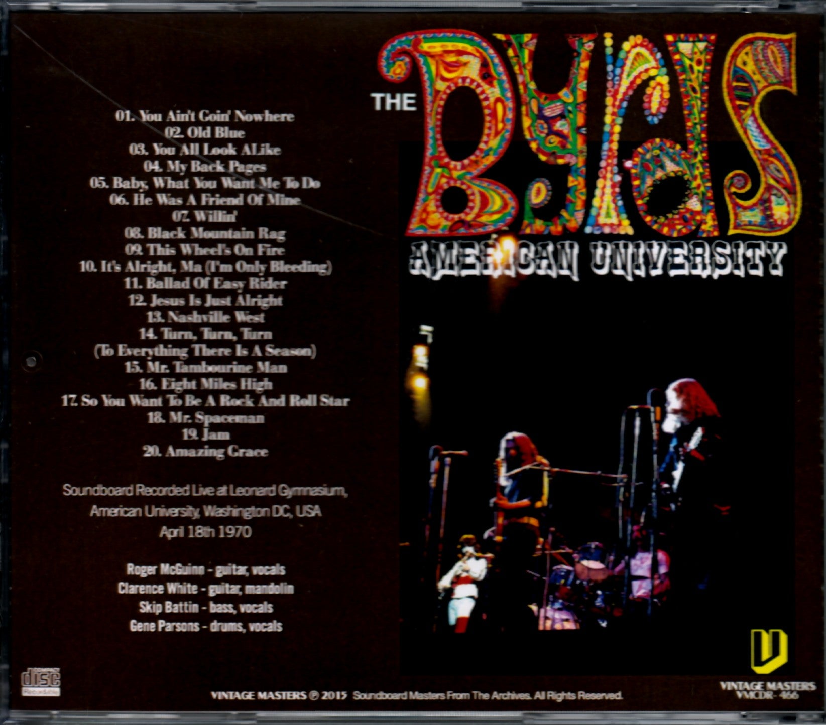 01. You Ain't Goin' Nowhere/02. Old Blue/03. You All Look Alike/04. My Back Pages/05. Baby, What You Want Me To Do/06. He Was A Friend Of Mine/07. Willin'/08. Black Mountain Rag/09. This Wheel's On Fire/10. It's Alright, Ma (I'm Only Bleeding)/11. Ballad Of Easy Rider/ 12. Jesus Is Just Alright/13. Nashville West/14 . Turn, Turn, Turn (To Everything There Is A Season)/15. Mr. Tambourine Man/16. Eight Miles High/17. So You Want To Be A Rock And Roll Star/18. Mr. Spaceman/19. Jam /20. Amazing Grace [Live at Leonard Gymnasium, American University, Washington DC, USA April 18th 1970 : stereo soundboard recording]