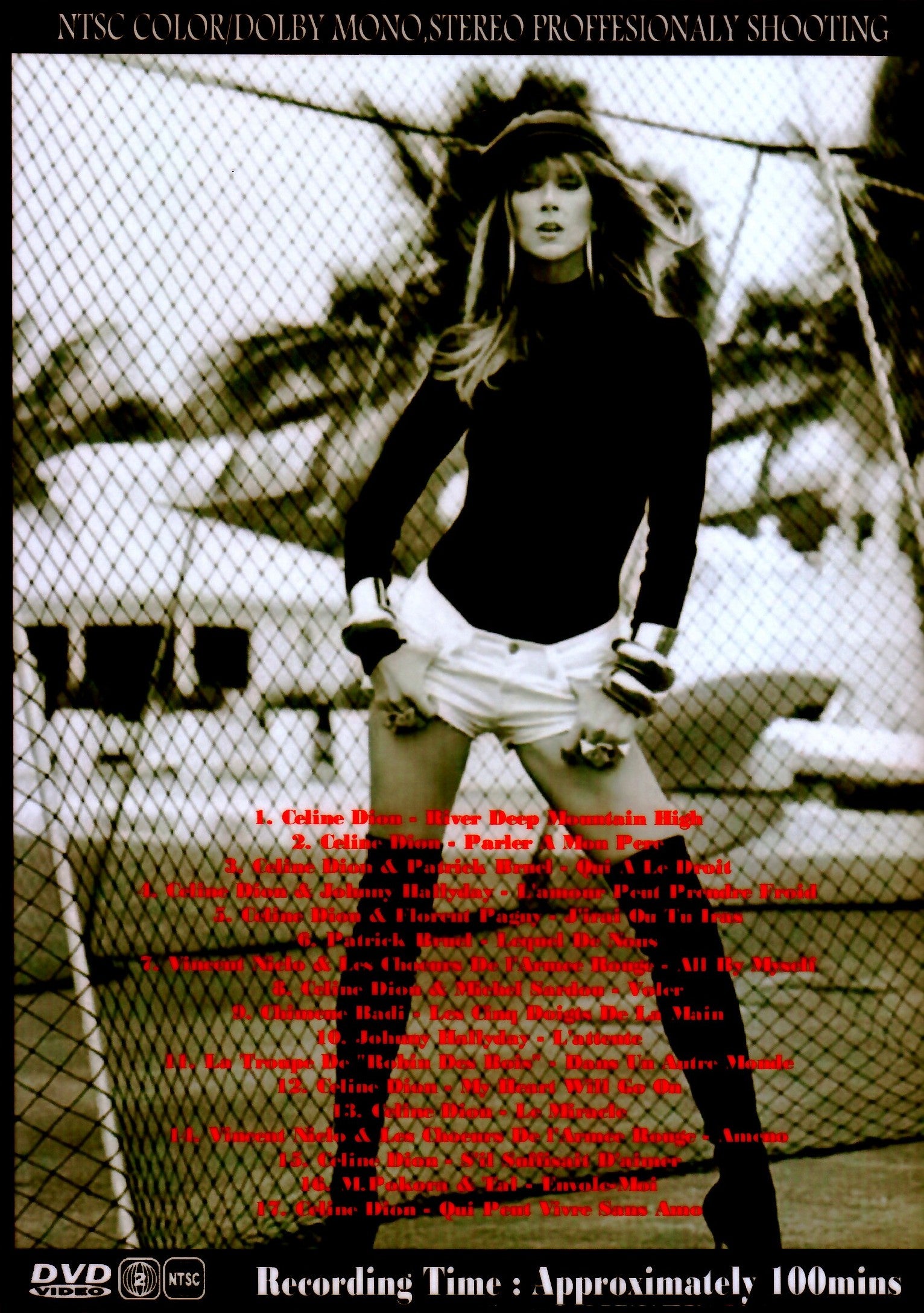 DVD 1. Celine Dion - River Deep Mountain High 2. Celine Dion - Parler A Mon Pere 3. Celine Dion & Patrick Bruel - Qui A Le Droit 4. Celine Dion & Johnny Hallyday - L'amour Peut Prendre Froid 5. Celine Dion & Florent Pagny - J'irai Ou Tu Iras 6. Patrick Bruel - Lequel De Nous 7. Vincent Niclo & Les Choeurs De l'Armee Rouge - All By Myself 8. Celine Dion & Michel Sardou - Voler 9. Chimene Badi - Les Cinq Doigts De La Main 10. Johnny Hallyday - L'attente 11. La Troupe De "Robin Des Bois" - Dans Un Autre Monde 12. Celine Dion - My Heart Will Go On 13. Celine Dion - Le Miracle 14. Vincent Niclo & Les Choeurs De l'Armee Rouge - Ameno 15. Celine Dion - S'il Suffisait D'aimer 16. M.Pokora & Tal - Envole-Moi 17. Celine Dion - Qui Peut Vivre Sans Amo DVD Format: NTSC Source: Pro-Shot (Multi-Camera) Video Quality: Rating: 9.0 Menus: Yes Chapter Selection: Yes Total Running Time: 104 Min.