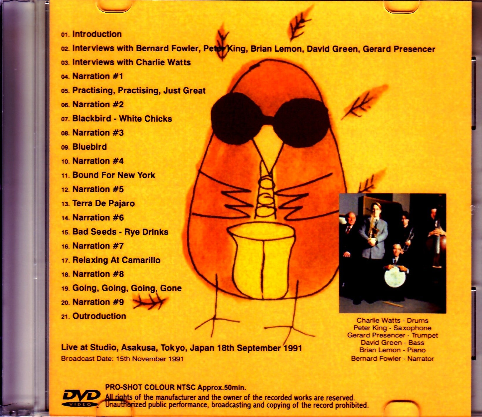 Narration by Bernard Fowler Practicing, Practicing, Just Great Blackbird - White Chicks Bluebird Bound For New York Terra De Pajaro Badseeds - Rye Drinks Relaxing At Camarillo Going, Going, Going, Gone Outro [Recorded live at Studio,Asakusa Tokyo, Japan : 18th September 1991 : Pro-Shot Color NTSC 50min]