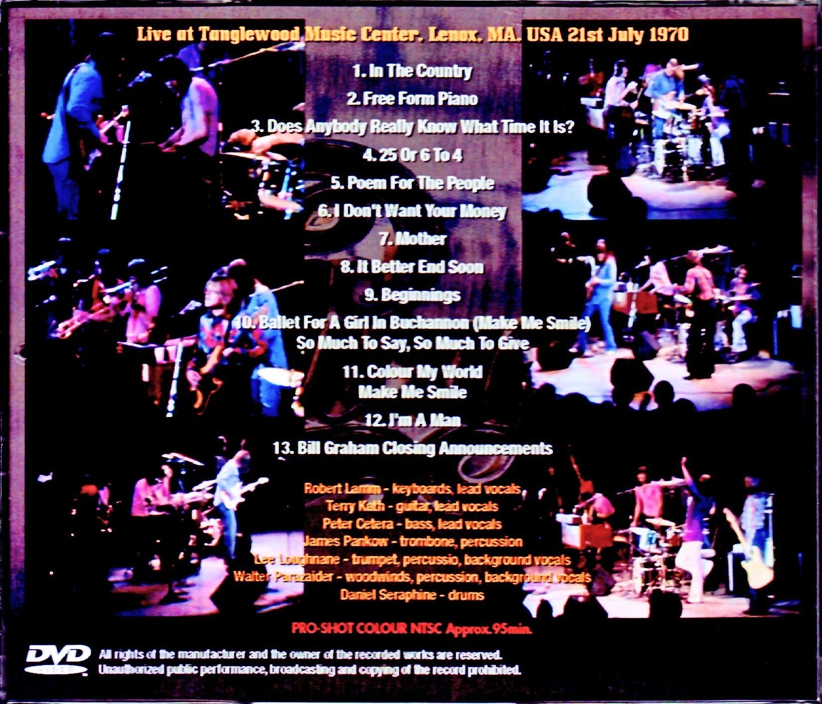 1. In The Country 2. Free Form Piano 3. Does Anybody Really Know What Time It Is? 4. 25 or 6 to 4 5. Poem for the People 6. I Don't Want Your Money 7. Mother 8. It Better End Soon 9. Beginnings 10. Ballet For A Girl In Buchannon (Make Me Smile) / So Much To Say, So Much To Give 11. Color My World / Make Me Smile 12. I'm a Man 13. Bill Graham Closing Announcements Robert Lamm - keyboards, lead vocals Terry Kath - guitar, lead vocals Peter Cetera - bass, lead vocals James Pankow - trombone, percussion Lee Loughnane - trumpet, percussio, background vocals Walter Parazaider - woodwinds, percussion, background vocals Daniel Seraphine - drums PRO -SHOT COLOR NTSC Approx.95min.