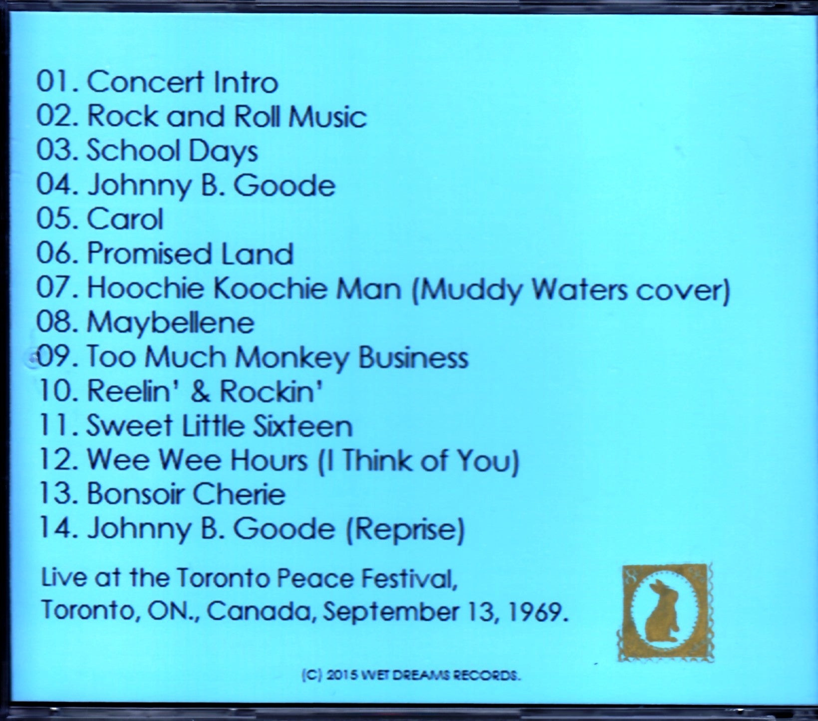 01. Concert Intro / 02. Rock and Roll Music / 03. School Days / 04. Johnny B. Goode / 05. Carol / 06. Promised Land / 07. Hoochie Koochie Man (Muddy Waters cover) / 08. Maybellene / 09. Too Much Monkey Business / 10. Reelin' & Rockin' / 11. Sweet Little Sixteen / 12. Wee Wee Hours (I Think of You) / 13. Bonsoir Cherie / 14. Johnny B. Goode (Reprise) [The Toronto Peace Festival : at Toronto, ON., Canada, September 13th 1969 : soundboard recording]