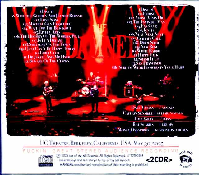 UC Theatre,Berkeley,California,USA May 30,2025 (Disc 1) 01.The Man With the Golden Arm [Elmer Bernstein] (tape) 02.Love Song 03.Machine Gun Etiquette 04.Wait For The Blackout 05.Lively Arts 06.The History Of The World, Pt. 1 07.Is It A Dream 08.Stranger On The Town 09.I Just Can't Be Happy Today 10.Limit Club 11.Dr.Jekyll And Mr.Hyde 12.Beware Of The Clown (Disc 2) 01.Eloise 02.Alone Again Or 03.The Invisible Man 04.Fan Club 05.Ignite 06.Neat Neat Neat 07.Curtain Call 08.Drum Solo 09.New Rose 10.White Rabbit 11.Happy Talk 12.Smash It Up 13.San Francisco (Be Sure to Wear Flowers in Your Hair) [Scott McKenzies] Dave Vanian / vocals Captain Sensible / guitar, vocals Paul Gray/ bass Rat Scabies/ drums Monty Oxymoron/ keyboards, vocals