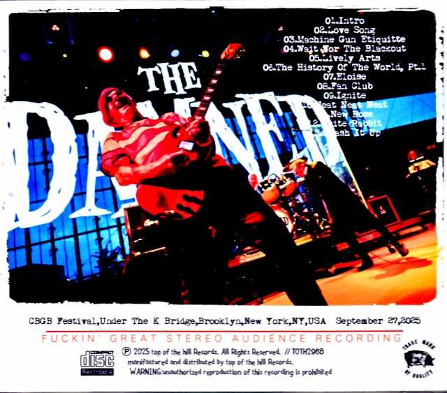 This live performance, featuring the band's 80s lineup, was recorded in high-quality digital PCM, stereo, and audience recordings, from their latest tour, featuring the band's appearance at the CBGB Festival in Brooklyn! In 2023, they released their 12th album, "DARKADELIC," their first in five years since "EVIL SPIRITS," and performed in Japan in March 2024. This recording features the band's latest tour, featuring the band's 80s lineup, featuring their appearance at the CBGB Festival in Brooklyn on September 27, 2025, recorded in high-quality digital PCM, stereo, and audience recordings! Directly digitally transferred from the digital PCM master, the vocals are crisp and clear, with each part exceptionally well-balanced and deep, providing a clear sound quality. The band returns with original drummer Rat Scabies, and adds keyboardist Monty Oxymoron, who joined the '80s lineup of Dave Vanian, Captain Sensible, and Paul Gray on the 2001 album "GRAVE DISORDER." The setlist includes early hits like "Love Song" and "Neat Neat Neat," as well as killer tunes that sum up their career to date, like the 1986 single "Eloise," and a cover of Jefferson Airplane's "White Rabbit," a single released in 1980 only in France and Germany. CBGB Festival,Under The K Bridge,Brooklyn,New York,NY,USA September 27,2025 01.Intro 02.Love Song 03.Machine Gun Etiquitte 04.Wait For The Blackout 05.Lively Arts 06.The History Of The World, Pt.1 07.Eloise 08.Fan Club 09.Ignite 10.Neat Neat Neat 11.New Rose 12.White Rabbit 13.Smash It Up Dave Vanian / vocals Captain Sensible / guitar, vocals Paul Gray / bass Rat Scabies / drums Monty Oxymoron / keyboards, vocals