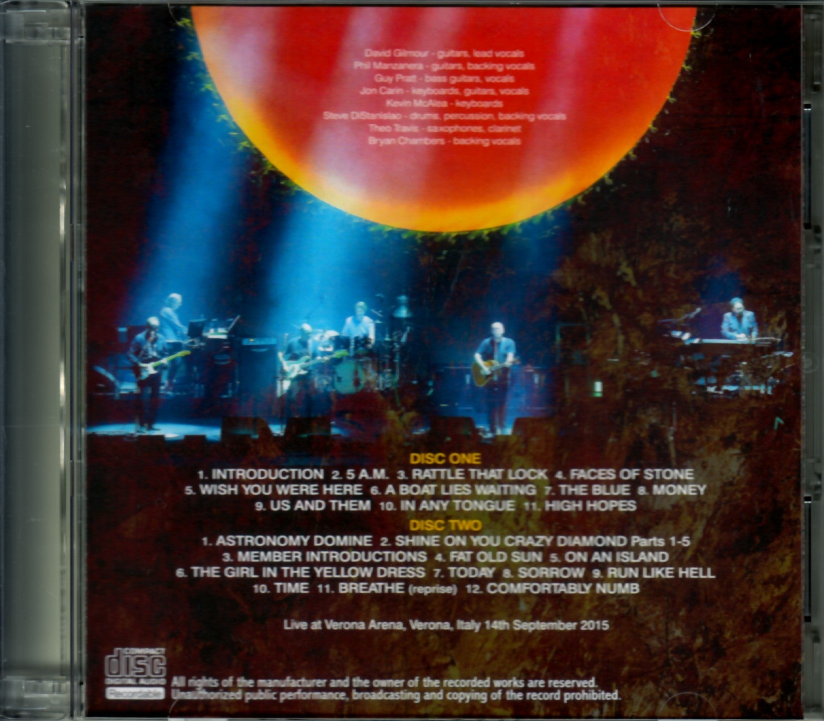 Disc 1(66:17) 1. Introduction 2. 5AM 3. Rattle That Lock 4. Faces Of Stone 5. Wish You Were Here 6. A Boat Lies Waiting 7. The Blue 8. Money 9. Us And Them 10. In Any Tongue 11. High Hopes Disc 2(79:04) 1. Astronomy Domine 2. Shine On You Crazy Diamond Pts. 1-5 3. Member Introductions 4. Fat Old Sun 5. On An Island 6. The Girl In The Yellow Dress 7. Today 8. Sorrow 9. Run Like Hell 10. Time 11. Breathe(Reprise) 12. Comfortably Numb David Gilmour - guitars, lead vocals Phil Manzanera - guitars, backing vocals Guy Pratt - bass guitars, vocals Jon Carin - keyboards , guitars, vocals Kevin McAlea - keyboards Steve DiStanislao - drums, percussion, backing vocals Theo Travis - saxophones, clarinet Bryan Chambers - backing vocals