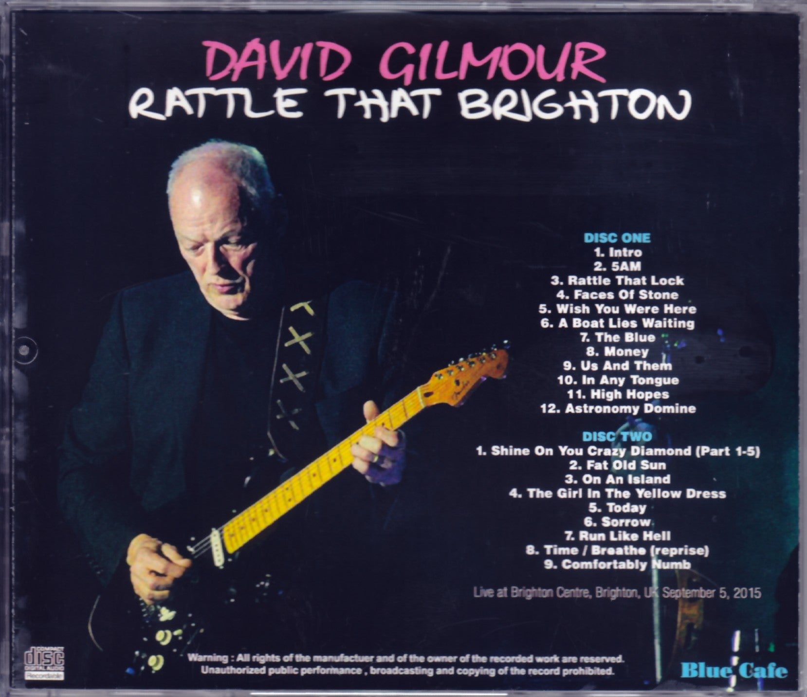 In conjunction with the release of his 2015 solo album ``Rattle That Rock,'' he began a UK tour in the fall. The first day of the event, the Brighton performance on September 5th, is completely recorded in high quality digital audience recording. First of all, the first half is centered on numbers from the same album, interweaving Floyd numbers here and there, from "Heaven's Rule" to "Crazy Diamond" and "Money" to the last song "Comfortably Numb". The setlist, which summarizes his career, is a must-listen for fans after Floyd's death. DISC ONE : 1. Intro/2. 5AM/3. Rattle That Lock/4. Faces Of Stone/5. Wish You Were Here/6. A Boat Lies Waiting/7. The Blue/8. Money/9. Us And Them/10. In Any Tongue/11. High Hopes/12. Astronomy Domine DISC TWO : 1. Shine On You Crazy Diamond (Part 1-5)/2. Fat Old Sun/3. On An Island/4. The Girl In The Yellow Dress/5. Today/6. Sorrow/7. Run Like Hell/8. Time / Breathe (reprise)/9. Comfortably Numb [Live at Brighton Centre, Brighton, UK September 5th 2015]