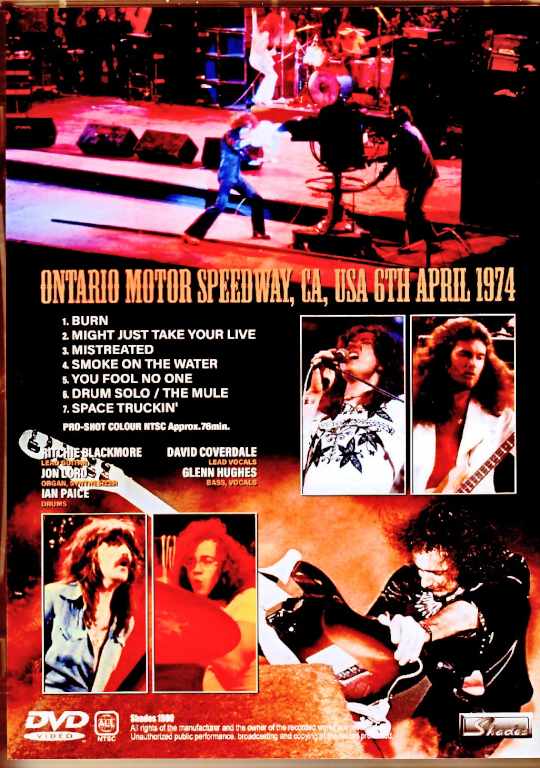 Ontario Motor Speedway, CA, USA 6th April 1974 PRO-SHOT*UPGRADE!!! (76:14) 1. Burn 2. Might Just Take Your Live 3. Mistreated 4. Smoke On The Water 5. You Fool No One 6. Drum Solo / The Mule 7. Space Truckin' David Coverdale - Vocals Ritchie Blackmore - Guitar Glenn Hughes - Bass, Vocals Jon Lord - Keyboards Ian Paice - Drums PRO-SHOT COLOUR NTSC Approx.76min.