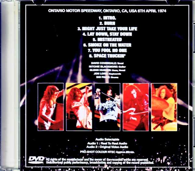 Ontario Motor Speedway, Ontario, CA, USA 6th April 1974 Audio Selectable Audio 1 : Reel To Reel Audio Audio 2 : Original Video Audio 1. Intro 2. Burn 3. Might Just Take Your Life 4. Lay Down, Stay Down 5. Mistreated 6. Smoke On The Water 7. You Fool No One 8. Space Truckin' David Coverdale - Vocals Ritchie Blackmore - Guitar Glenn Hughes - Bass, Vocals Jon Lord - Keyboards Ian Paice - Drums PRO-SHOT COLOUR NTSC Approx.85min.