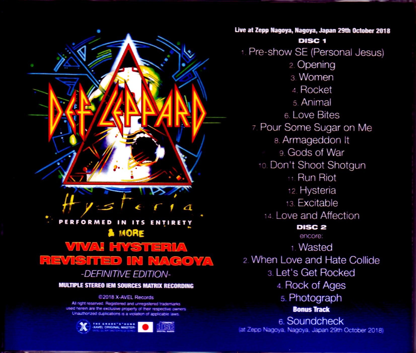 (CD 1) 01. Pre-show SE (Personal Jesus) 02. Opening 03. Women 04. Rocket 05. Animal 06. Love Bites 07. Pour Some Sugar on Me 08. Armageddon It 09. Gods of War 10. Don' t Shoot Shotgun 11. Run Riot 12. Hysteria 13. Excitable 14. Love and Affection (CD 2) Encore: 01. Wasted 02. When Love and Hate Collide 03. Let's Get Rocked 04. Rock of Ages 05. Photograph Bonus Track 06. Soundcheck at Zepp Nagoya, Nagoya, Japan 29th October 2018 (DVD – 95min. AUD-shot ) 01. Opening 02. Women 03. Rocket 04. Animal 05. Love Bites 06. Pour Some Sugar on Me 07. Armageddon It 08. Gods of War 09. Don't Shoot Shotgun 10. Run Riot 11. Hysteria 12. Excitable 13. Love and Affection Encore: 14. Wasted 15. When Love and Hate Collide 16. Let's Get Rocked 17. Rock of Ages 18. Photograph