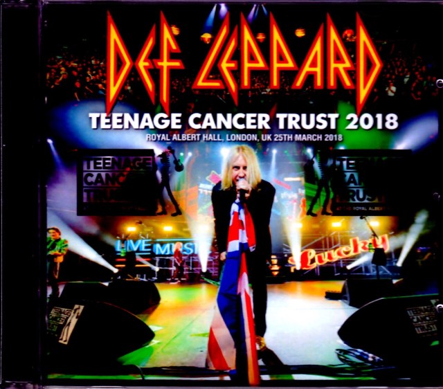 With a joint North American tour with Journey and a "HYSTERIA" re-enactment tour announced for 2018, this DVD contains a 123-minute complete recording of their appearance at the annual charity event "TEENAGE CANCER TRUST 2018" held at the Royal Albert Hall in London on March 25, 2018. Firstly, the annual charity concert hosted by Roger Daltrey was held over four days in 2018, and they were the final act on the final day. The concert was recreated with perfect quality, aided by the unique acoustics of the Royal Albert Hall, and the set was basically the same as the official live album "AND THERE WILL BE A NEXT TIME" released the previous year, but there were many highlights, such as a long-awaited performance of "When Love and Hate Collide" from "Vault" in the middle, and at the end of "Hysteria," Joe Elliott invited the audience to sing along to "Heroes" as well. Disc 1 : 1. Teenage Cancer Trust Speech / Roger Daltrey Intro 2. Won't Get Fooled Again 3. Let's Go 4. Animal 5. Let It Go 6. Dangerous 7. Foolin' 8. Love Bites 9. Armageddon It 10. Rock On 11. Man Enough Disc 2 : 1. When Love and Hate Collide 2. Rocket 3. Bringin' on the Heartbreak 4. Switch 625 5. Hysteria (incl. "Heroes") 6. Let's Get Rocked 7. Pour Some Sugar on Me 8. Rock of Ages 9. Photograph [Live at Royal Albert Hall, London, UK 25th March 2018] Joe Elliott - Lead Vocals / Phil Collen - Guitar, Vocals / Vivian Campbell - Guitar, Vocals / Rick Savage - Bass, Vocals / Rick Allen – Drums