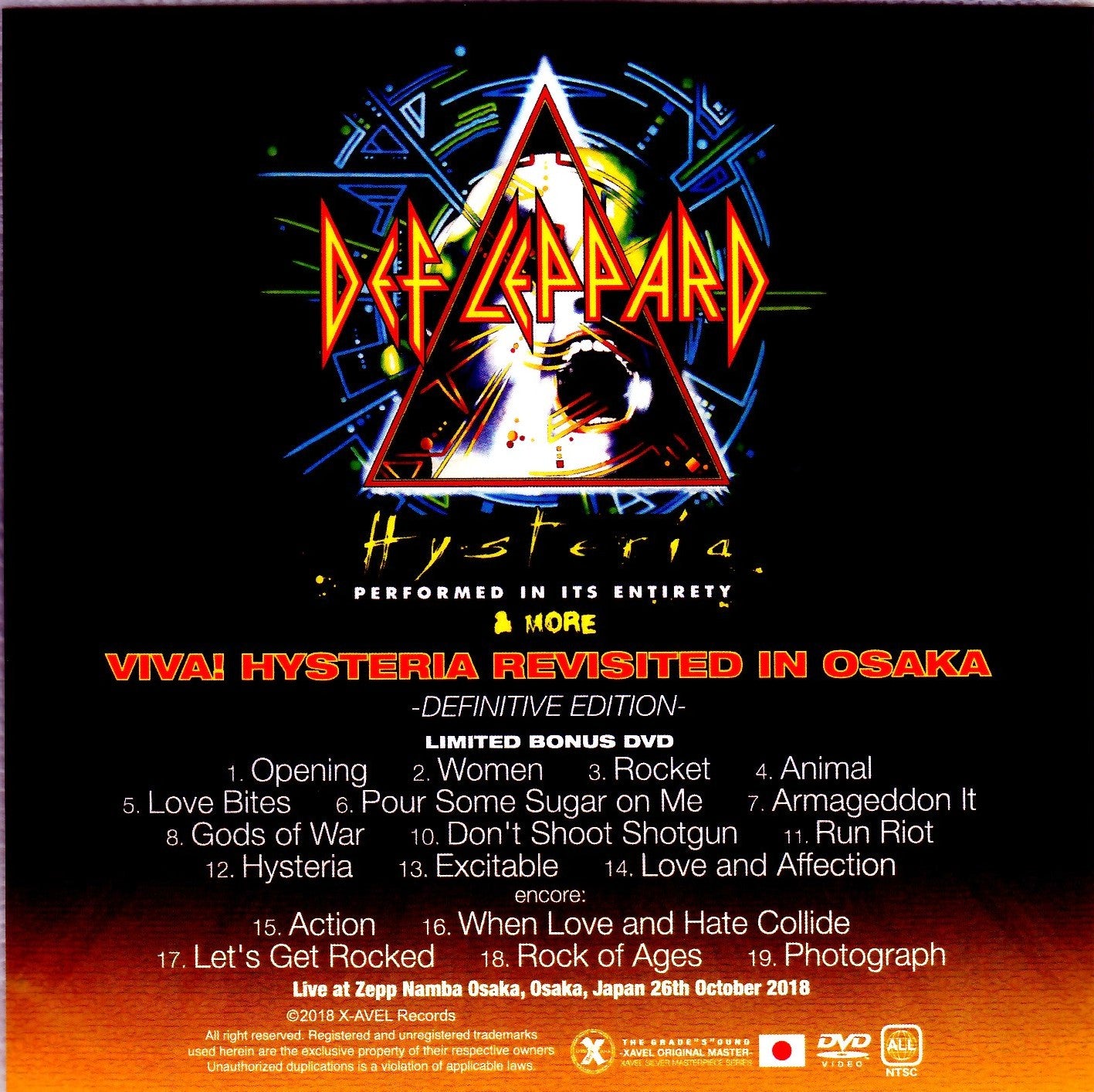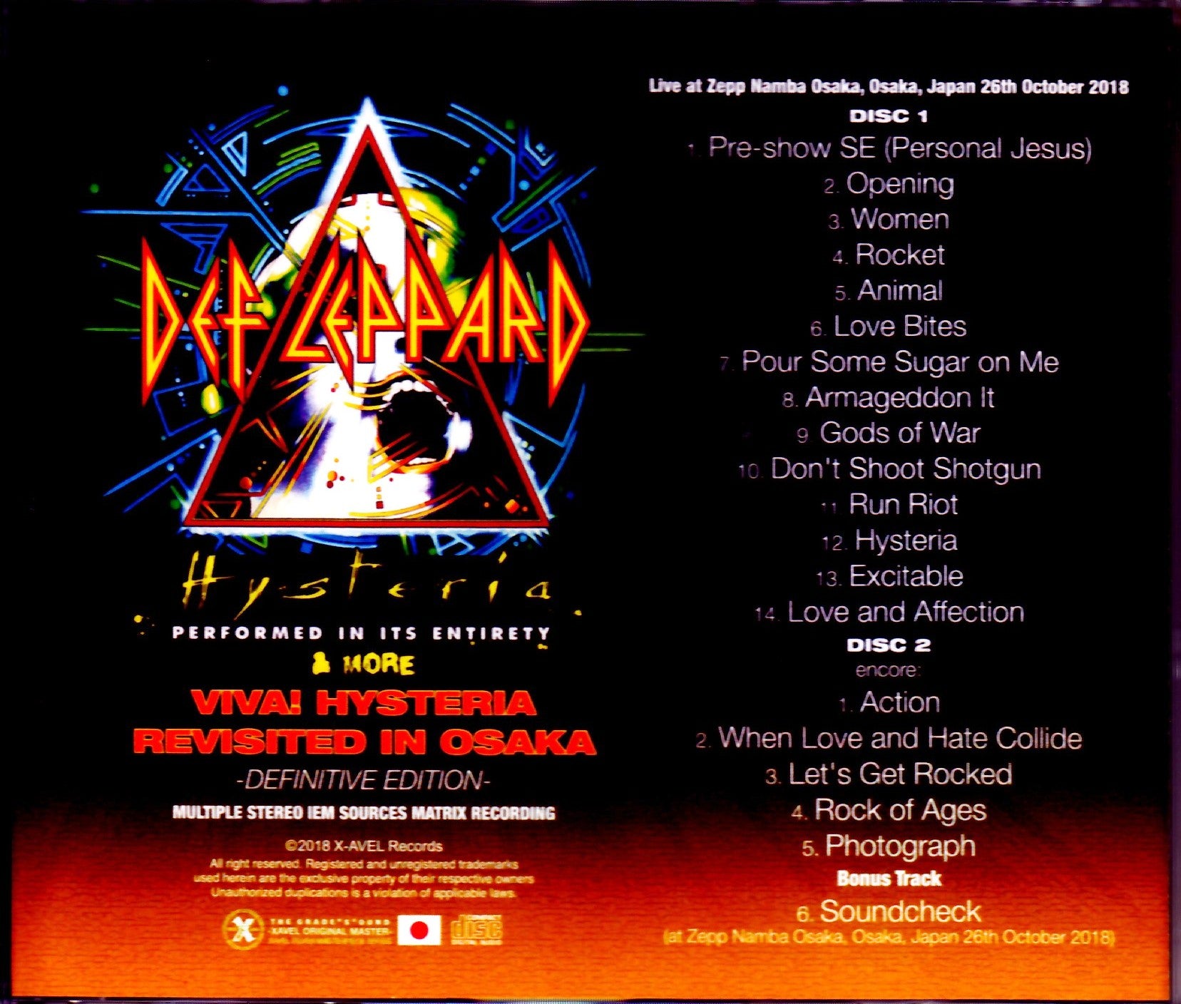 (CD 1) 01. Pre-show SE (Personal Jesus) 02. Opening 03. Women 04. Rocket 05. Animal 06. Love Bites 07. Pour Some Sugar on Me 08. Armageddon It 09. Gods of War 10. Don' t Shoot Shotgun 11. Run Riot 12. Hysteria 13. Excitable 14. Love and Affection (CD 2) Encore: 01. Action 02. When Love and Hate Collide 03. Let's Get Rocked 04. Rock of Ages 05. Photograph Bonus Track 06. Soundcheck at Zepp Namba Osaka, Osaka, Japan 26th October 2018 (DVD / 94min. AUD- shot) 01. Opening 02. Women 03. Rocket 04. Animal 05. Love Bites 06. Pour Some Sugar on Me 07. Armageddon It 08. Gods of War 09. Don't Shoot Shotgun 10. Run Riot 11. Hysteria 12. Excitable 13. Love and Affection Encore: 14. Action 15. When Love and Hate Collide 16. Let's Get Rocked 17. Rock of Ages 18. Photograph