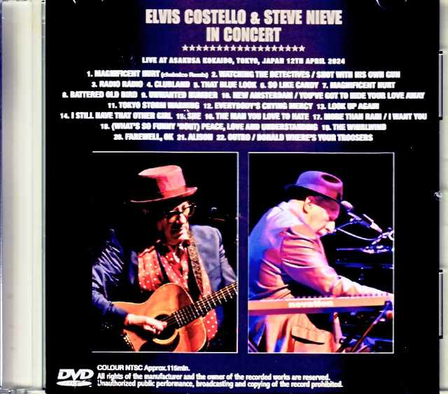 Costello's Japan tour ended with great success every day. As if to show how exciting it was, an additional performance in Asakusa was realized. The final day of the tour, which was realized in an unexpected place, was also a typical development for this Japan tour. Above all, the setlist changes that were unpredictable every day were possible only because of the light formation of Costello and Steve Nieve, and it exploded again on this day. From the opening, "Shot With His Own Gun" was included between "Watching The Detectives", and then it returned to "Watching The~". Until then, the songs were played alone, but suddenly this unexpected development. A video that fully captured the final day of the tour, which seemed to guarantee a different setlist from the other days just from this opening, has appeared on YouTube. The shooting position seems to have been at the back of the venue, so the angle was a bit low from start to finish. However, they did their best to close the show at various points, making it an amazing complete live video that you will never get tired of watching. A similar angle in past Costello live footage is the one-camera footage captured by the venue's camera at the 1989 CW Post College, which is familiar to enthusiasts, but this one is not as monotonous or distant as that one, and thanks to modern technology, it is easy to see even from a distant angle, and the image quality is clear. Of course, if you get too close up, Costello's figure will be blazing (lol), which is unavoidable because it is shot from a position that exceeds the limits of the camera's function, but I am grateful that they were able to produce such a clear video overall from this Japan tour. The opening alone was enough to shock us, but this day was a bit of a ``BLOOD & CHOCOLATE'' album night, with ``Battered Old Bird,'' ``Tokyo Storm Warning,'' and ``I Want You.'' In particular, the fresh arrangement of ``Tokyo Storm,'' which is appropriate for singing in this place, with Naive providing backing vocals, was impressive, and the scene where he worked hard on the chorus was also captured clearly. Although it was a live performance where filming was originally allowed, it is truly appreciated that a video of the entire live performance exists like this. In fact, I'm sure there were many people who witnessed the live performance that day from an angle like this. Asakusa Kokaido, Tokyo, Japan 12th April 2024 1. Magnificent Hurt (chelmico Remix) 2. Watching The Detectives / Shot With His Own Gun 3. Radio Radio 4. Clubland 5. That Blue Look 6. So Like Candy 7. Magnificent Hurt 8. Battered Old Bird 9. Unwanted Number 10. New Amsterdam / You've Got To Hide Your Love Away 11. Tokyo Storm Warning 12. Everybody's Crying Mercy 13. Look Up Again 14. I Still Have That Other Girl 15. She 16. The Man You Love To Hate 17. More Than Rain/I Want You 18. (What's So Funny 'Bout) Peace, Love And Understanding 19. The Whirlwind 20. Farewell, OK 21. Alison 22. Outro/Donald Where's Your Troosers COLOUR NTSC Approx. 115 min.