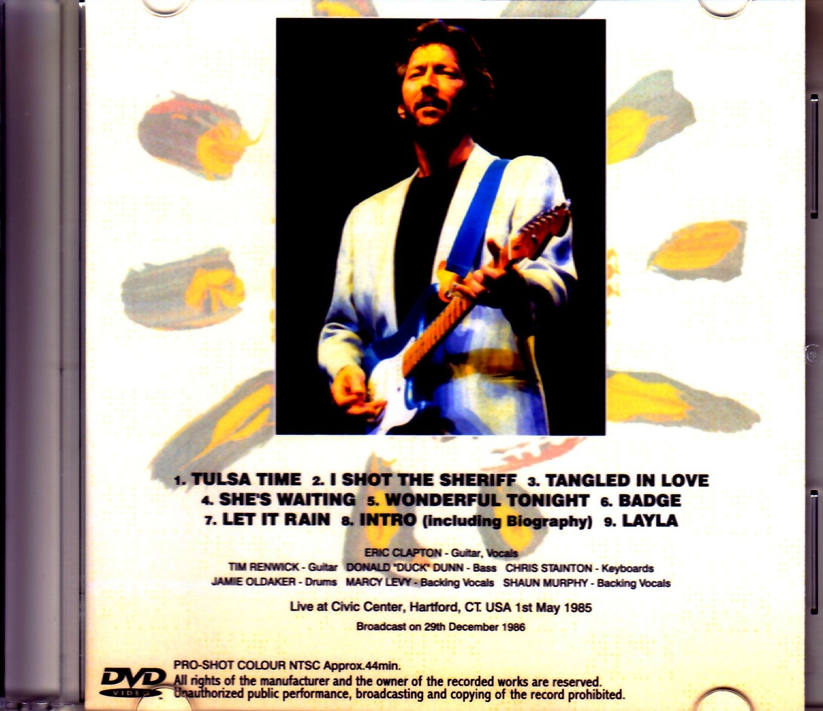 Live at the Civic Center, Hartford, Connecticut, USA 1st May 1985 PRO-SHOT (78:31) Tulsa Time I Shot The Sheriff Tangled In Love She's Waiting Wonderful Tonight Badge Let It Rain Layla Eric Clapton - guitar / vocals Tim Renwick - guitar Chris Stainton - keyboards Donald 'Duck' Dunn - bass Jamie Oldaker - drums Marcy Levy - backing vocals Shaun Murphy - backing vocals PRO-SHOT COLOUR NTSC Approx.44min.