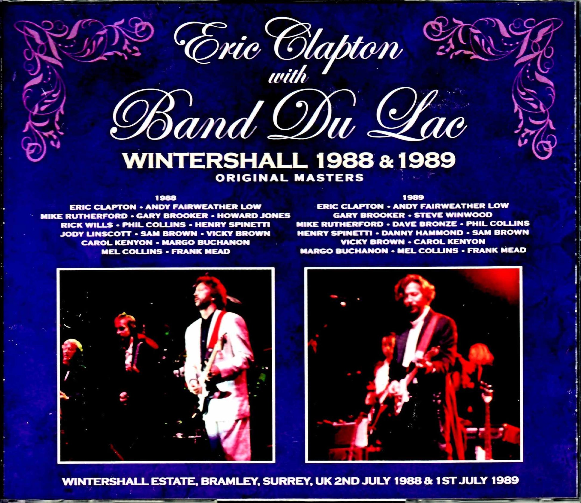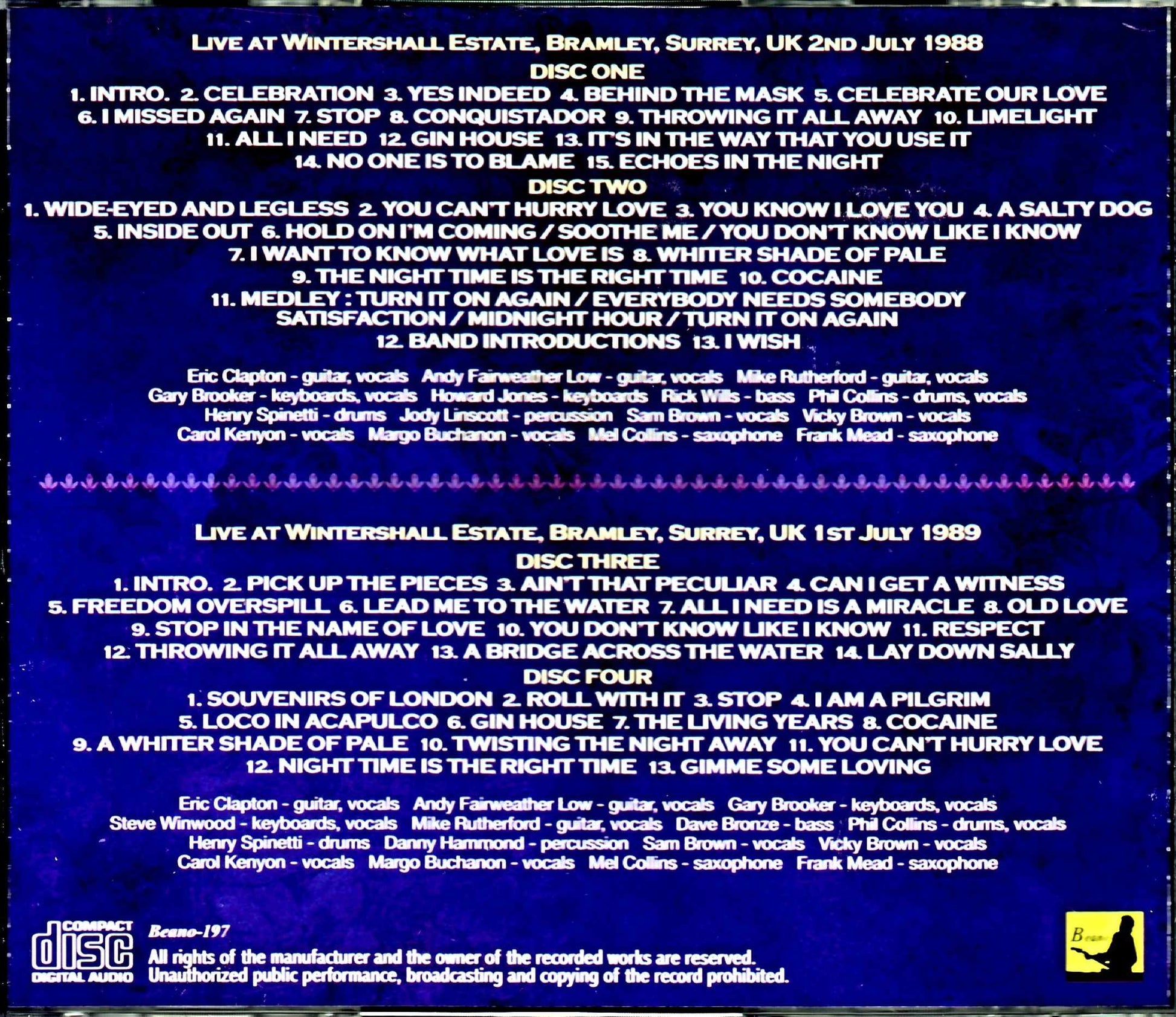 Disc 1 (78:00) 1. Intro. 2. Celebration 3. Yes Indeed 4. Behind The Mask 5. Celebrate Our Love 6. I Missed Again 7. Stop 8. Conquistador 9. Throwing It All Away 10. Limelight 11. All I Need 12. Gin House 13. It's In The Way That You Use It 14. No One Is To Blame 15. Echoes In The Night Disc 2 (77:46) 1. Wide-Eyed And Legless 2. You Can't Hurry Love 3. You Know I Love You 4. A Salty Dog 5. Inside Out 6. Hold On I'm Coming / Soothe Me / You Don't Know Like I Know 7. I Want To Know What Love Is 8. Whiter Shade Of Pale 9. The Night Time Is The Right Time 10. Cocaine 11. Medley : Turn It On Again / Everybody Needs Somebody / Satisfaction / Midnight Hour / Turn It On Again 12. Band Introductions 13. I Wish Eric Clapton - guitar / vocals Andy Fairweather Low - guitar / vocals Mike Rutherford - guitar / vocals Gary Brooker - keyboards / vocals Howard Jones - keyboards Rick Wills - bass Phil Collins - drums / vocals Henry Spinetti - drums Jody Linscott - percussion Sam Brown - vocals Vicky Brown - vocals Carol Kenyon - vocals Margo Buchanon - vocals Mel Collins - saxophone Frank Mead - saxophone Live at Wintershall Estate, Bramley, Surrey, UK 1st July 1989 Disc 3 (71:16) 1. Intro. 2. Pick Up The Pieces 3. Ain' t That Peculiar 4. Can I Get a Witness 5. Freedom Overspill 6. Lead Me To The Water 7. All I Need is a Miracle 8. Old Love 9. Stop In The Name of Love 10. You Don't Know Like I Know 11. Respect 12. Throwing It All Away 13. A Bridge Across The Water 14. Lay Down Sally Disc 4 (75:19) 1. Souvenirs of London 2. Roll With It 3. Stop 4. I Am a Pilgrim 5. Loco in Acapulco 6. Gin House 7. The Living Years 8. Cocaine 9. A Whiter Shade of Pale 10. Twisting The Night Away 11. You Can't Hurry Love 12. Night Time is the Right Time 13. Gimme Some Loving Eric Clapton - guitar / vocals Andy Fairweather Low - guitar / vocals Gary Brooker - keyboards / vocals Steve Winwood - keyboards / vocals Mike Rutherford - guitar / vocals Dave Bronze - bass Phil Collins - drums / vocals Henry Spinetti - drums Danny Hammond - percussion Sam Brown - vocals Vicky Brown - vocals Carol Kenyon - vocals Margo Buchanon - vocals Mel Collins - saxophone Frank Mead - saxophone