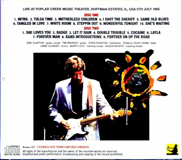 Poplar Creek Music Theater, Hoffman Estates, IL, USA 5th July 1985 STEREO SBD(from Original Masters) UPGRADE Disc:1 (53:24) 1. Intro. 2. Tulsa Time 3. Motherless Children 4. I Shot the Sheriff 5. Same Old Blues 6. Tangled In Love 7. White Room 8. Steppin Out 9. Wonderful Tonight 10. She's Waiting Disc 2 (52:12) 1. She Loves You 2. Badge 3. Let it Rain 4. Double Trouble 5. Cocaine 6. Layla 7. Forever Man 8. Band Introductions 9. Further On Up the Road STEREO SOUNDBOARD RECORDING Eric Clapton - guitar / vocals Tim Renwick - guitar Chris Stainton - keyboards Donald 'Duck' Dunn - bass Jamie Oldaker - drums Marcy Levy - backing vocals Shaun Murphy - backing vocals
