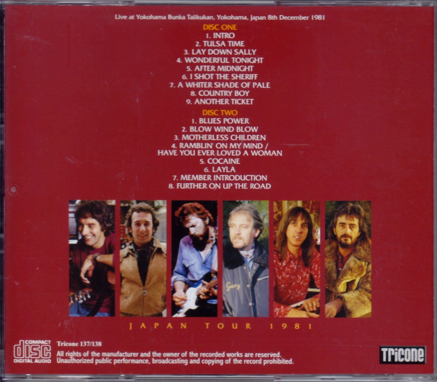 The live album "JUST ONE NIGHT", which recorded the 1979 Japan performance, was released the following year and became a huge hit, reaching number 2 in the United States. As a result, Eric Clapton shifted his band personality and musicality in that direction, and the following year, in 1981, he visited Japan for the fifth time. This CD is a complete recording of the Yokohama Cultural Gymnasium performance on December 8th from that 1981 Japan tour in superb stereo sound quality. We will release this performance with a new original master that is different from other previously released titles that had excessive equalization! Written by Mr. Taper, who is known for his works such as ``BRITISH PRIDE'', ``JUST ONE NIGHT IN MITO'' (Mito 11/23/79), and ``PERPETUAL BLACK'' (Niigata 11/27/81), and this album is also directly from Mr. Taper. I use the provided master cassette tape directly. This disc includes the "announcement of concert precautions" by Udo Music Office staff before the band appears (the last part also includes BGM when leaving the venue after the performance). Just hearing this brings me back to those days. The sound quality is very clear and can be said to be the best that accurately captures the sound of the day. This is a genuine complete version with perfect sound balance and no problems during recording. There is also no clapping near the recorder in the up-tempo number that was in “LET ME IN”. We never expected that a master with this superb sound quality would be discovered for the first time in 34 years. With this quality, it has to be released into the world. With that strong belief, I made it into a CD. The performance of Clapton and the band on this day was especially wonderful even on this Japan tour. There are many emotional moments like this where Blackie cries and groans. If you like "JUST ONE NIGHT," you'll probably find it "unbearable." Moreover, the band at this time included Gary Brooker, the leader and keyboardist of Procol Harum, a veteran British rock band. Reflecting this, in the middle of the album, his big hit number A Whiter Shade Of Pale (Japanese title: Blue Shadow) is played. For this song and the next song, Country Boy, featuring Albert Lee, Clapton left the stage (which is why Albert Lee took the guitar solo in the middle of A Whiter Shade Of Pale), but then he played again. In the then-new title number Another Ticket, which appeared and was played, they showed off a play that could be called the height of mellowness. And Muddy Waters' blues Blow Wind Blow from the same album also creates the best groove. Furthermore, the nostalgic Motherless Children from their 1974 comeback work "461 Ocean Boulevard". This groove is also great! And this withering condition is also amazing! From the deep blues Ramblin' On My Mind/Have You Ever Loved A Woman, to the popular song Cocaine, which was the most requested by the venue, and then to Layla, the stage progressed towards a grand finale. Clapton on this day is really in great shape. Actually, at the Budokan performance the day before, there was an ``incident'' where she had to cut her Layla and get off the stage due to poor health, but on this day, she was doing well as if she were a completely different person. This edition is not to be missed even by those who have “LET ME IN”. The Yokohama performance, which appears for the first time and is listened to with a completely different master, is a lump of oxidized silver. Live at Yokohama Bunka Taiikukan, Yokohama, Japan 8th December 1981 PERFECT SOUND(from Original Masters) Disc 1 (47:08) 1. Intro 2. Tulsa Time 3. Lay Down Sally 4. Wonderful Tonight 5. After Midnight 6. I Shot The Sheriff 7. A Whiter Shade Of Pale 8. Country Boy 9. Another Ticket Disc 2 (51:24) 1. Blues Power 2. Blow Wind Blow 3. Motherless Children 4. Ramblin' On My Mind / Have You Ever Loved A Woman 5. Cocaine 6. Layla 7. Member Introduction 8. Further On Up The Road Eric Clapton : Guitar & Vocals Albert Lee : Guitar & Vocals Dave Markee : Bass Henry Spinetti : Drums Chris Stainton : Keyboards Gary Brooker : Keyboards & Vocals