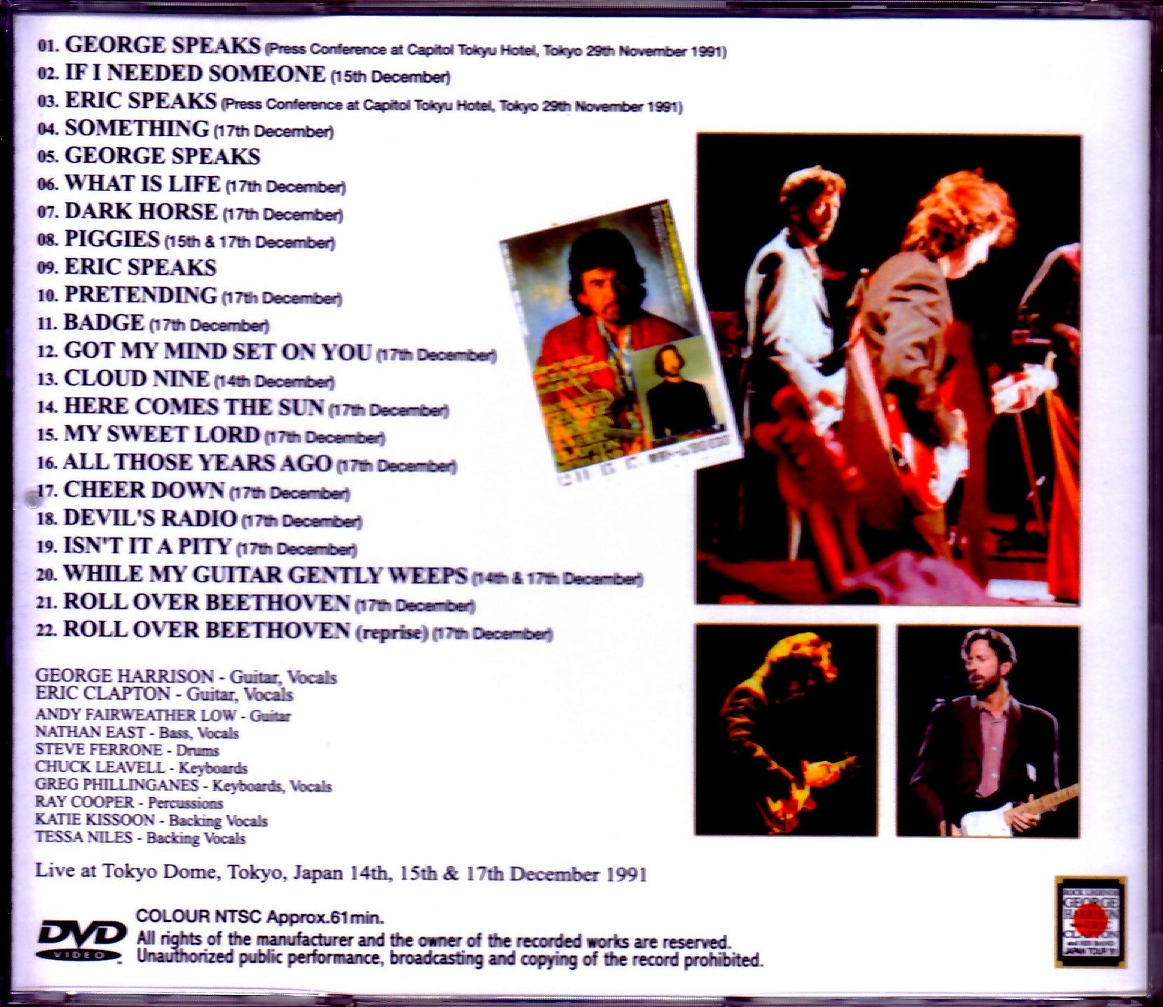 1. George speaks (Press Conference at Capitol Tokyo Hotel, Tokyo 29th November) 2. If I Needed Someone (15th December) 3. Eric speaks (Press Conference at Capitol Tokyu Hotel, Tokyo 29th November) 4. Something (17th December) 5 . George speaks 6. What Is Life (17th December) 7. Dark Horse (17th December) 8. Piggies (15th & 17th December) 9. Eric speaks 10. Pretending (17th December) 11. Badge (17th December) 12. Got My Mind Set On You (17th December) 13. Cloud 9 (14th December) 14. Here Comes The Sun (17th December) 15. My Sweet Lord (17th December) 16. All Those Years Ago (17th December) 17. Cheer Down (17th December) 18. Devil's Radio (17th December) 19. Isn't It A Pity (17th December) 20. While My Guitar Gently Weeps (14th & 17th December) 21. Roll Over Beethoven (17th December) 22. Roll Over Beethoven (reprise) (17th December) George Harrison - guitar, vocals Eric Clapton - guitar, vocals Andy Fairweather Low - guitar Chuck Leavell - keyboards Greg Phillinganes - keyboards Nathan East - bass, vocals Steve Ferrone - drums Ray Cooper - percussion Katie Kissoon - backing vocals Tessa Niles - backing vocals COLOR NTSC Approx.61min.