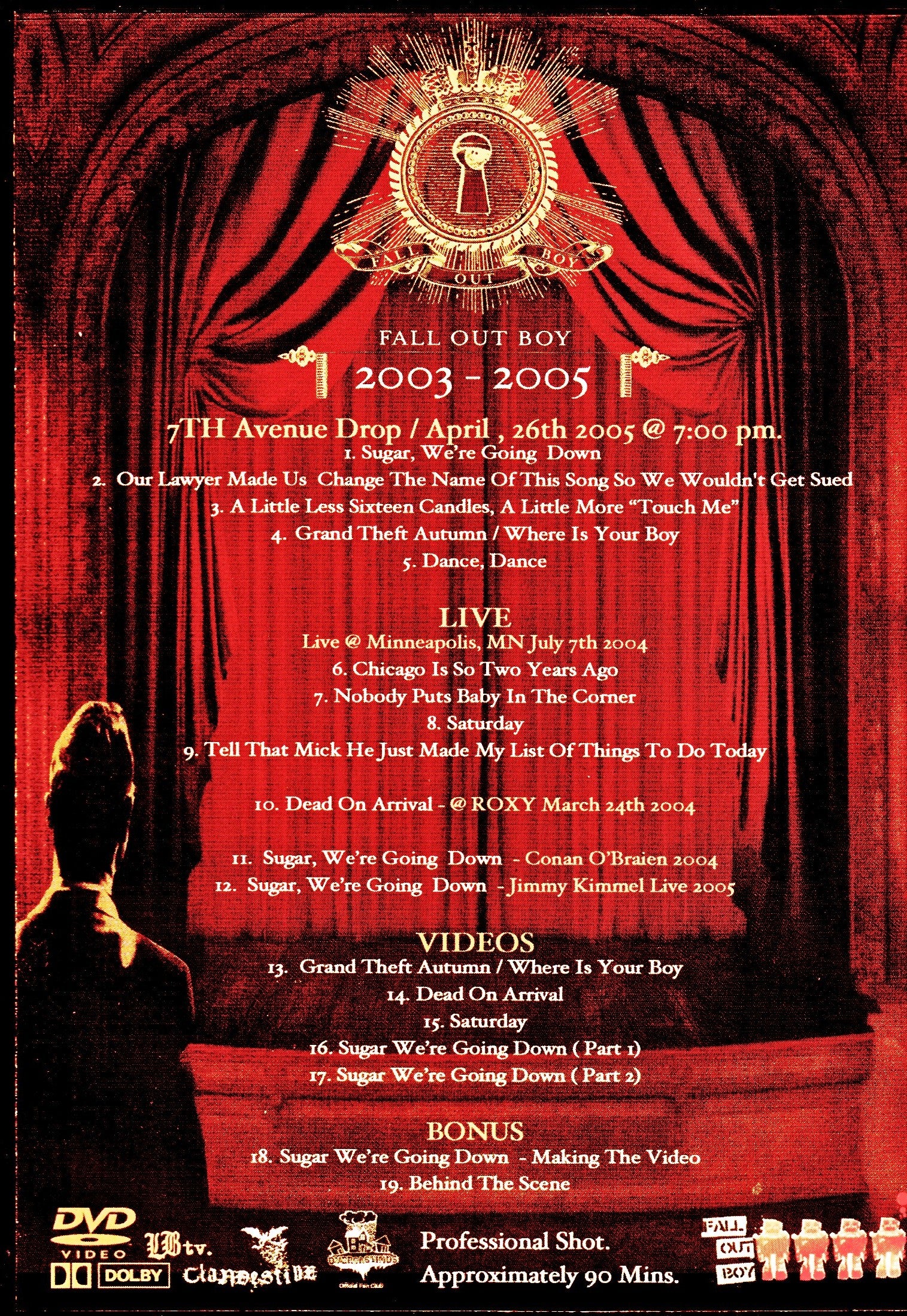 01. SUGAR, WE'RE GOING DOWN 02. OUR LAWYER MADE US CHANGE THE NAME OF THIS SONG SO WE WOULDN'T GET SUED 03. A LITTLE LESS SIXTEEN CANDLES, A LITTLE MORE “TOUCH ME” 04. GRAND THEFT AUTUMN / WHERE IS YOUR BOY 05. DANCE, DANCE LIVE @ MINNEAPOLIS, MN JULY 7TH 2004 06. CHICAGO IS SO TWO YEARS AGO 07. NOBODY PUTS BABY IN THE CORNER 08. SATURDAY 09. TELL THAT MICK HE JUST MADE MY LIST OF THINGS TO DO TODAY 10. DEAD ON ARRIVAL - @ ROXY MARCH 24TH 2004 11. SUGAR, WE'RE GOING DOWN - CONAN O'BRAIEN 2004 12. SUGAR, WE'RE GOING DOWN - JIMMY KIMMEL LIVE 2005 VIDEOS 13. GRAND THEFT AUTUMN / WHERE IS YOUR BOY 14. DEAD ON ARRIVAL 15. SATURDAY 16. SUGAR WE'RE GOING DOWN ( PART 1) 17. SUGAR WE'RE GOING DOWN ( PART 2) BONUS 18. SUGAR WE'RE GOING DOWN - MAKING THE VIDEO 19. BEHIND THE SCENE Recording time: 90 minutes Number of discs: 1 Source: Proshot Image quality: AA Sound quality: AA